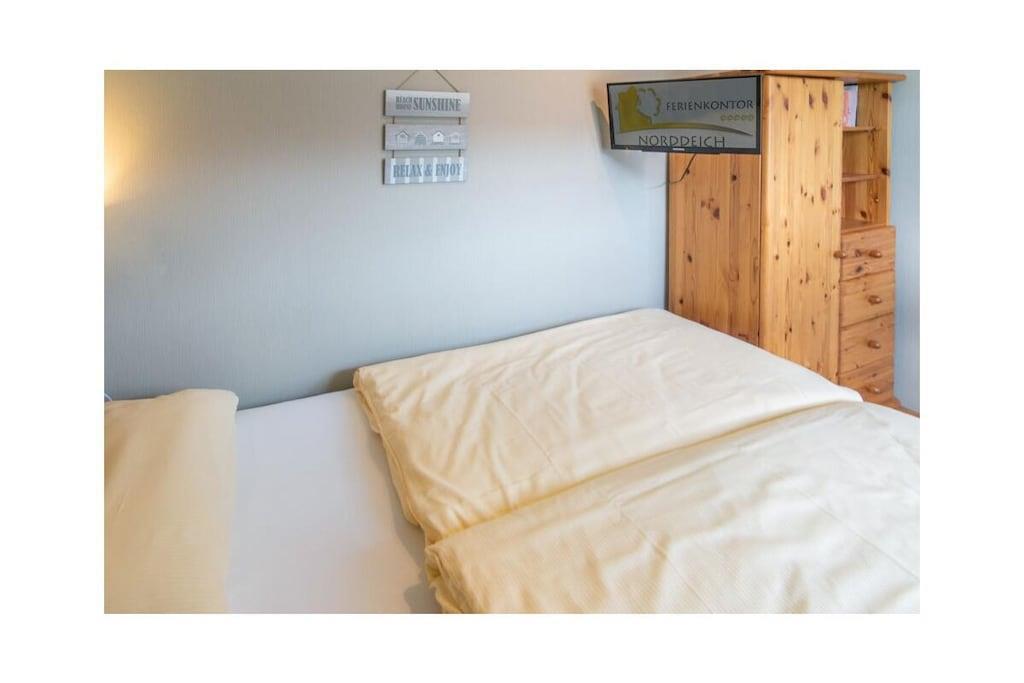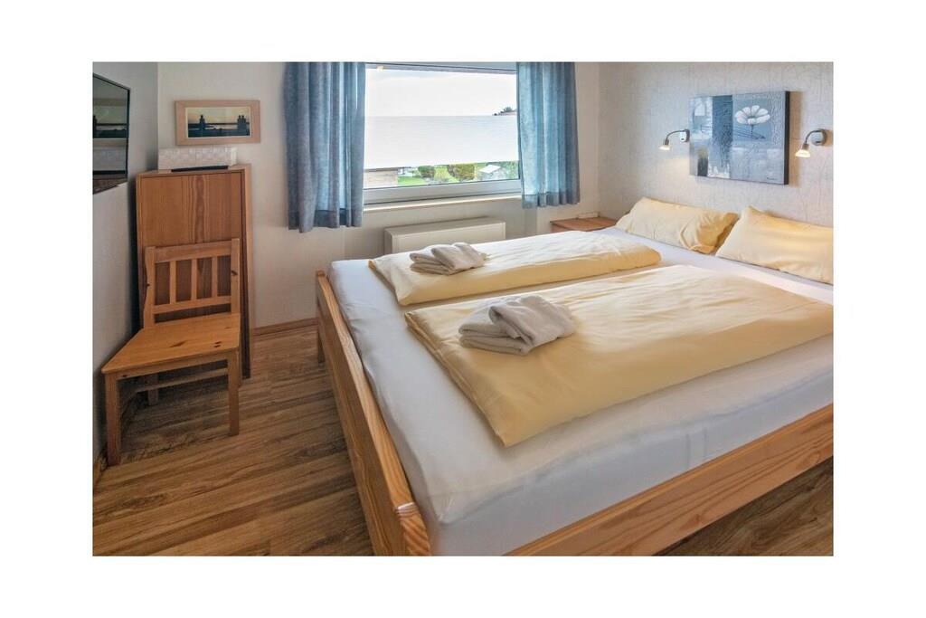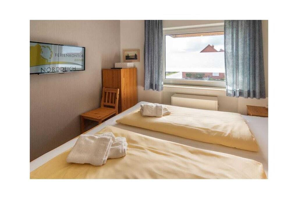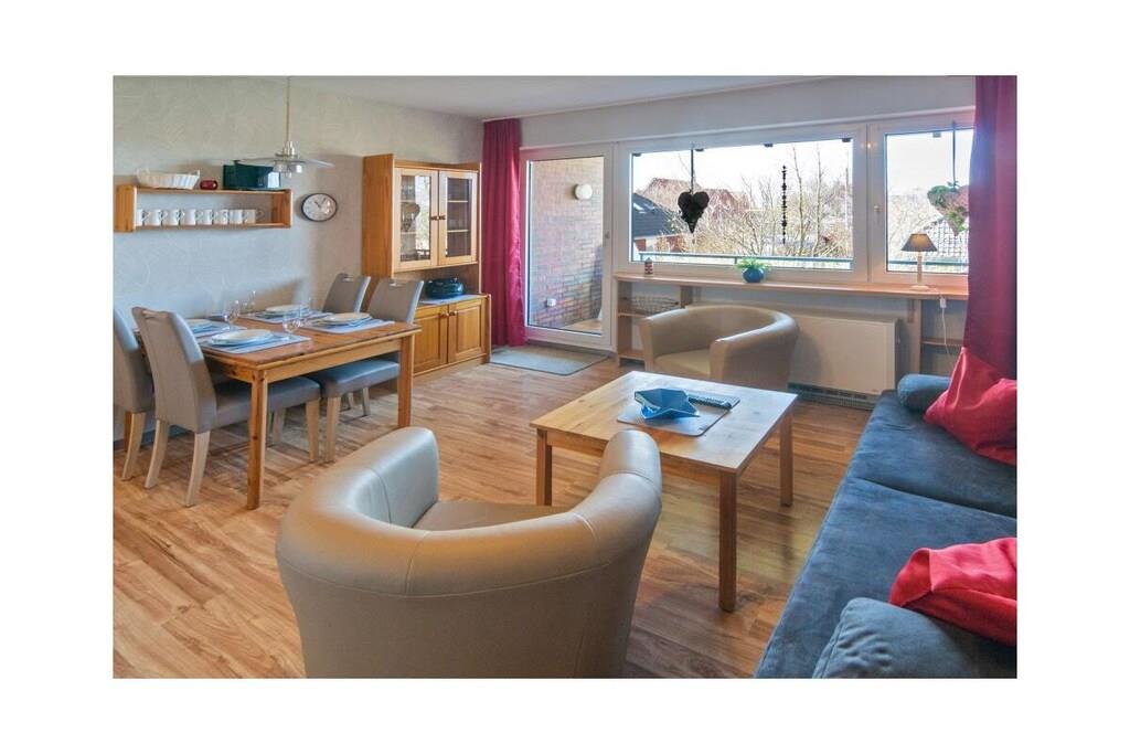 Beach shell, Deichstr.15, Norden In the beach shell you can spend long holidays and quiet hours. From the beach shell you can reach the North Sea in just a few minutes and spend time on the beach. The northern kingdom is also not far away. The small center of the city with its attractive restaurants and great hospitality ensures many beautiful memories. The house The apartment is on the first floor and is therefore always easily accessible even for older people. With a side view of the dike, you can have dinner on the adjacent balcony! Of course you can also enjoy breakfast here - depending on your personal preferences. The first bedroom has a 160 x 200 cm double bed. In addition to this there is also a wardrobe with plenty of storage space. There is also a small television, which allows for cozy evenings in bed. The 180 x 200 cm double bed in the second bedroom, as well as a wardrobe and a chest of drawers offer plenty of space to spread out. There is also a television in this room. Thanks to the shutters, both bedrooms can be darkened at night. The living and dining area is also equipped with a television. There are also several seating options as well as a radio and (board) games.As the living and dining room is connected to both the kitchen and the balcony, breakfast can be brought directly outside. The kitchenette has dishes for three people, a hotplate, a refrigerator and an oven. For all coffee lovers, the freely usable coffee machine and the Senseo should be a great addition. You don't have to go without your morning toast either, because the toaster is always ready for use.The balcony faces west and is therefore mainly exposed to the sun in the evening. The seating area with tables and chairs invites you to enjoy the sunny evenings.