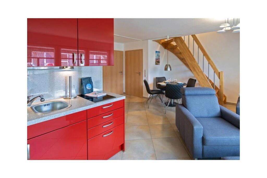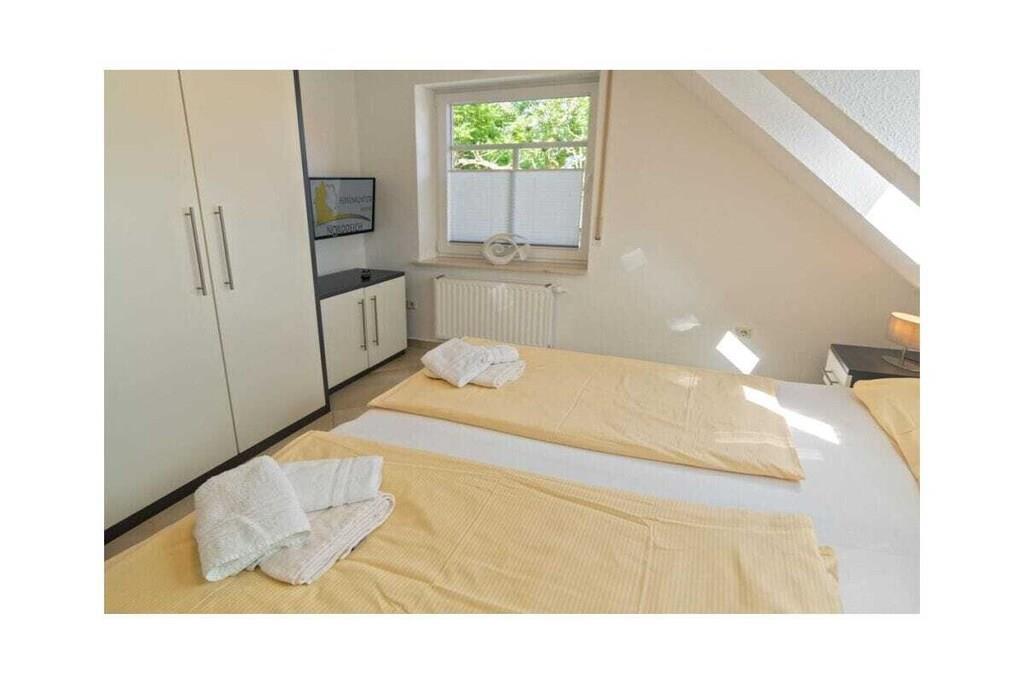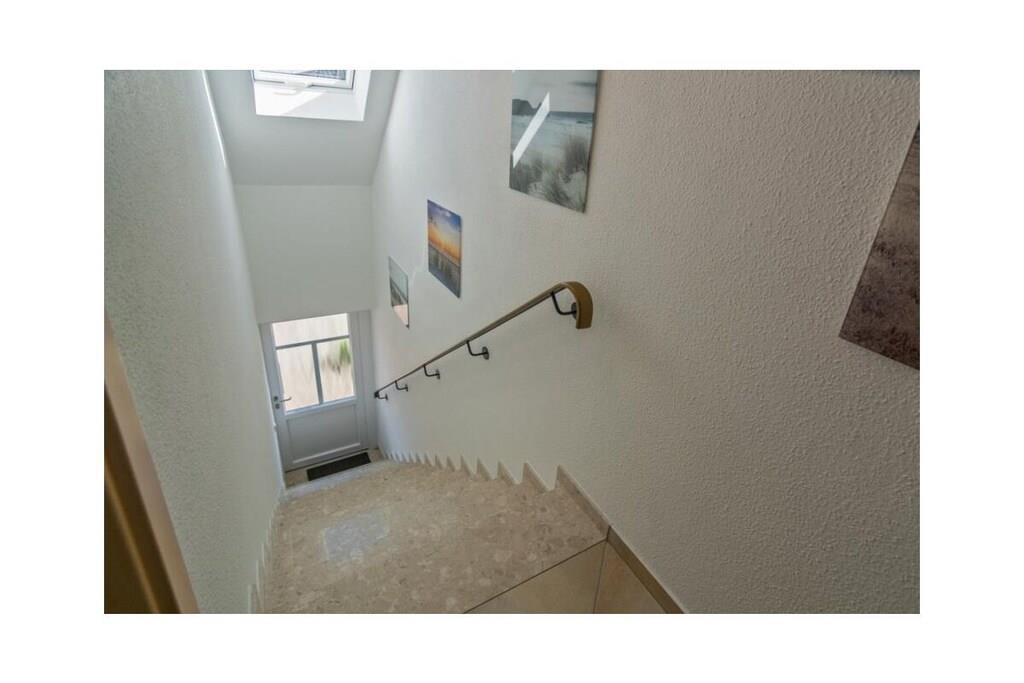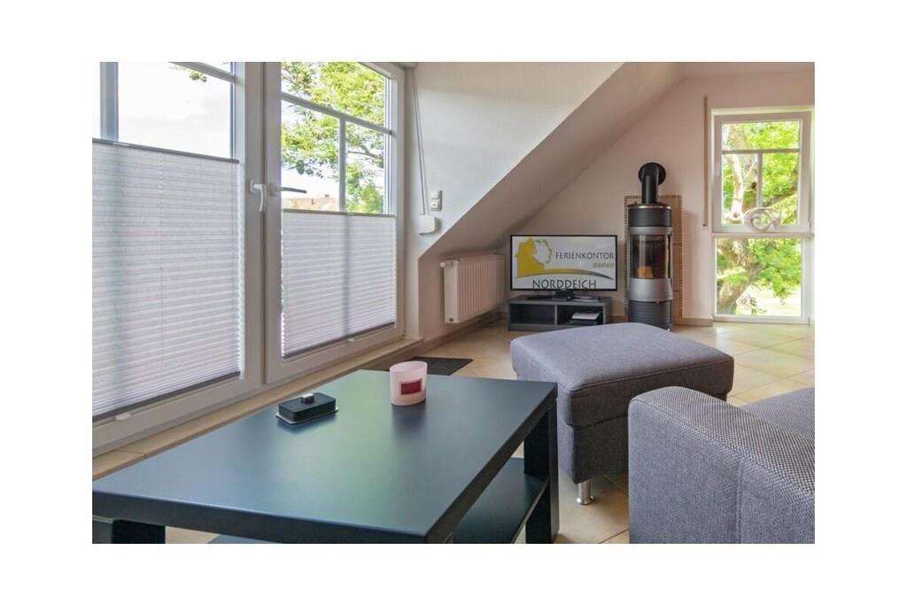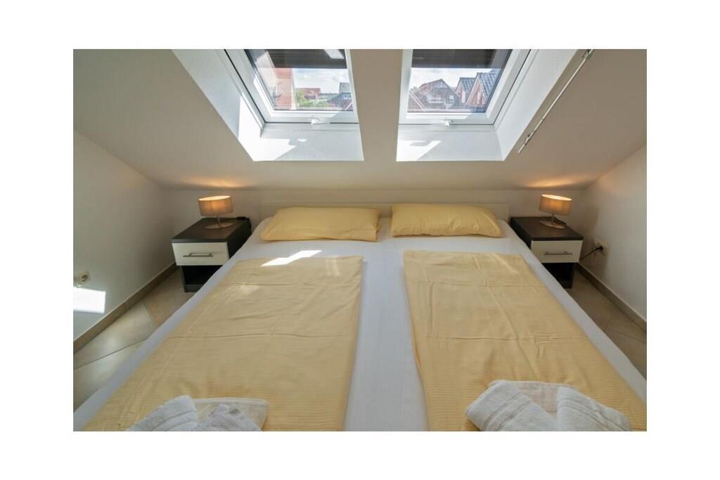 Holiday apartment Shila The holiday apartment Shila offers you a fully equipped and centrally located living space for your beach holiday in Norddeich. You are only a short walk from the beach and the shopping street. So you can stroll comfortably through the town on foot. The apartment is in a cul-de-sac and can be reached via a staircase. In the apartment on the upper floor you will find a spacious and cozy living room for relaxing together after an eventful day. There is also a TV with DVD player available here. So don't forget to bring your favorite films with you. The apartment is completely open plan. Directly adjacent to the living room is a dining table with four chairs and a state-of-the-art kitchenette. The kitchen is equipped with a stove, coffee machine, refrigerator, oven, toaster, glasses and dishes so that you don't have to go without anything during your stay. You also have access to a freezer. Perfect for your family vacation As a family of four, you will find enough sleeping space. On the lower floor there is a double bed (180 x 200 cm) with romantic Velux roof windows, which are equipped with blinds and pleats. In addition, the sleeping area on the ground floor is equipped with a chest of drawers and bedside lamps. Two further single beds (100 x 200 cm), which are next to each other, are on the upper floor. Here, too, you benefit from roof windows as a light source. The beds are next to each other and face the TV. You can store your clothes in the closet. The bathroom is fully tiled with a shower, mirror, towel dryer, sink and toilet. We are happy to provide you with towels and shower mats. A hairdryer is already available in the accommodation. Enjoy the sun on the balcony On warm days, let the sun shine on your stomach on the west-facing balcony or enjoy