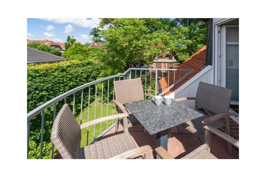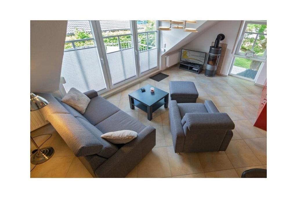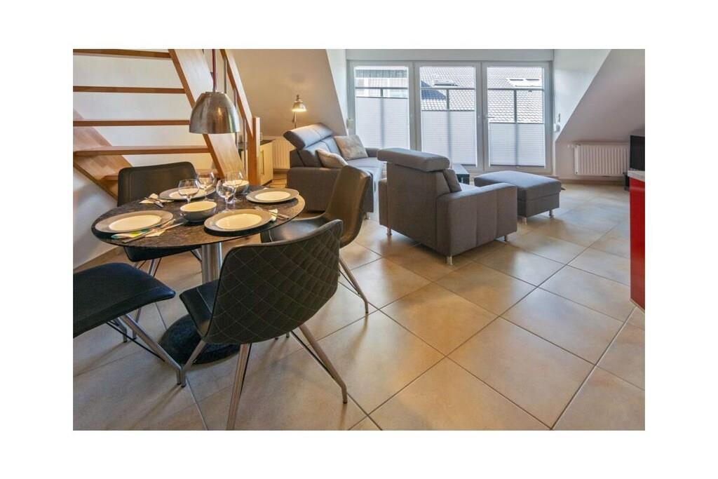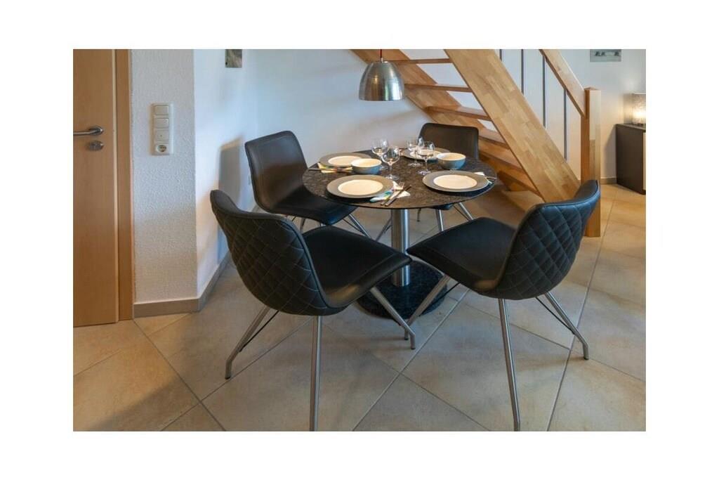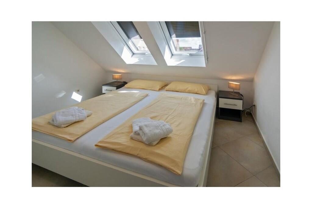 Holiday apartment Shila The holiday apartment Shila offers you a fully equipped and centrally located living space for your beach holiday in Norddeich. You are only a short walk from the beach and the shopping street. So you can stroll comfortably through the town on foot. The apartment is in a cul-de-sac and can be reached via a staircase. In the apartment on the upper floor you will find a spacious and cozy living room for relaxing together after an eventful day. There is also a TV with DVD player available here. So don't forget to bring your favorite films with you. The apartment is completely open plan. Directly adjacent to the living room is a dining table with four chairs and a state-of-the-art kitchenette. The kitchen is equipped with a stove, coffee machine, refrigerator, oven, toaster, glasses and dishes so that you don't have to go without anything during your stay. You also have access to a freezer. Perfect for your family vacation As a family of four, you will find enough sleeping space. On the lower floor there is a double bed (180 x 200 cm) with romantic Velux roof windows, which are equipped with blinds and pleats. In addition, the sleeping area on the ground floor is equipped with a chest of drawers and bedside lamps. Two further single beds (100 x 200 cm), which are next to each other, are on the upper floor. Here, too, you benefit from roof windows as a light source. The beds are next to each other and face the TV. You can store your clothes in the closet. The bathroom is fully tiled with a shower, mirror, towel dryer, sink and toilet. We are happy to provide you with towels and shower mats. A hairdryer is already available in the accommodation. Enjoy the sun on the balcony On warm days, let the sun shine on your stomach on the west-facing balcony or enjoy