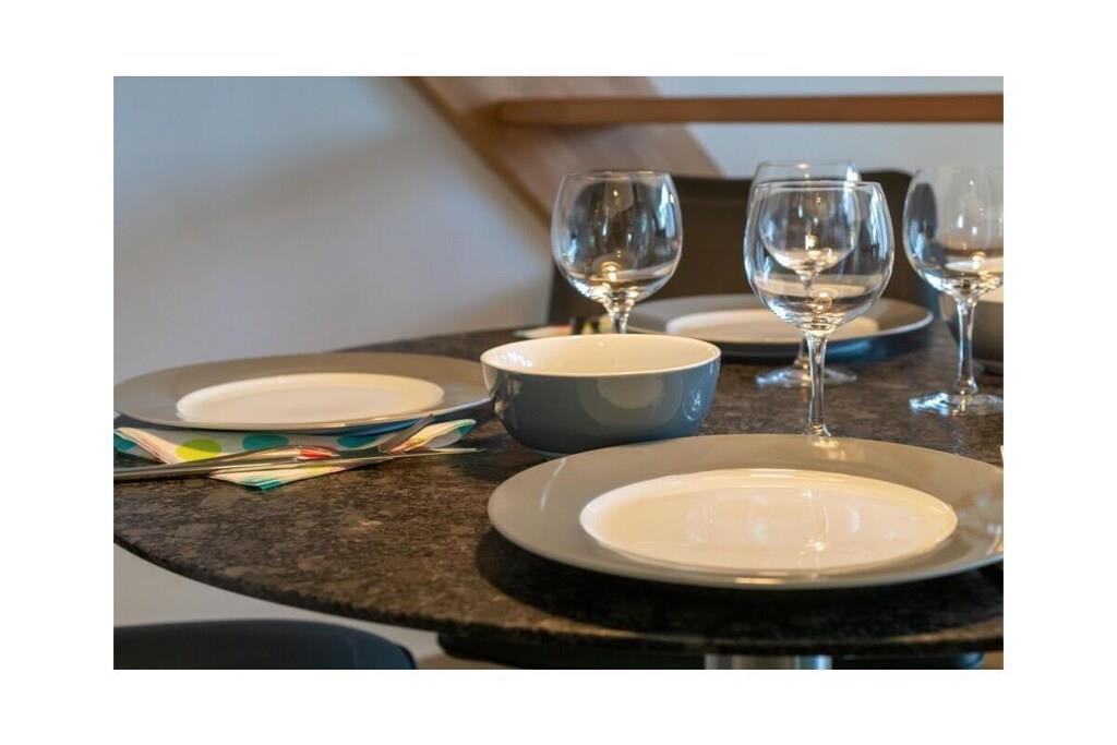 Ground floor: (hallway, Living room(TV, radio), Kitchen(hob, electric kettle, toaster, coffee machine, oven, dishwasher, fridge, freezer), bedroom(double bed), bedroom(children's bed), bathroom(shower, toilet, hairdryer)) washing machine, balcony, garden furniture, parking, iron