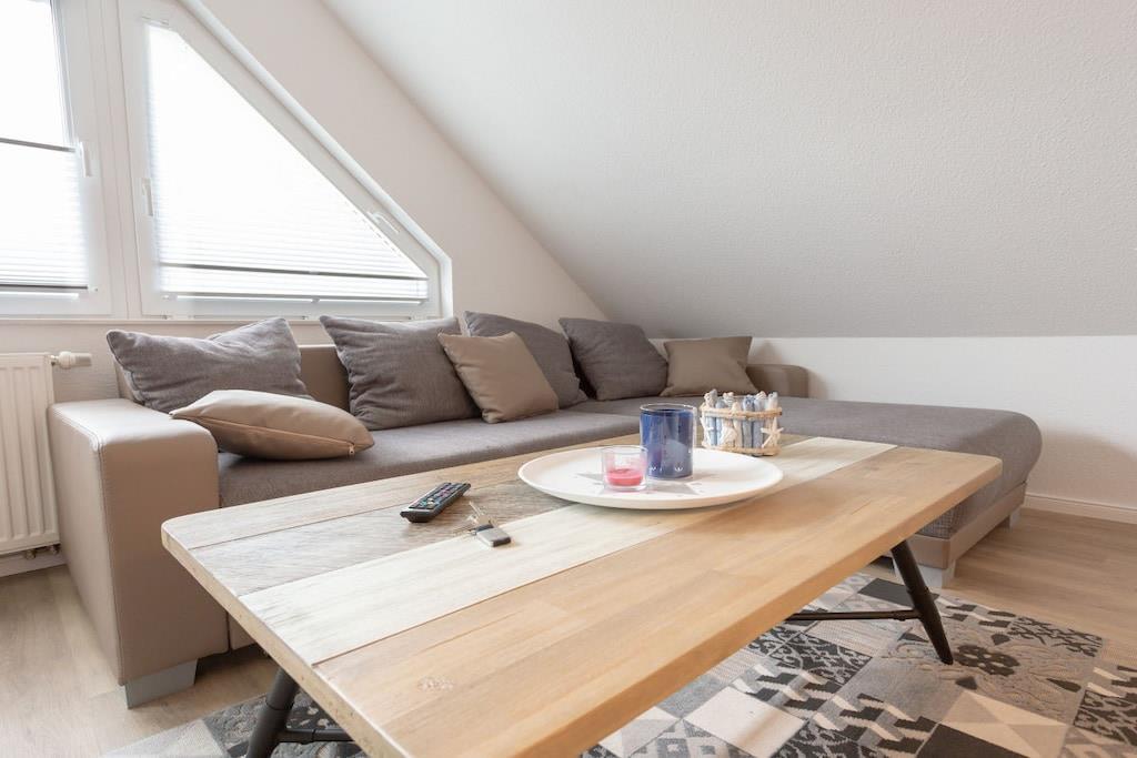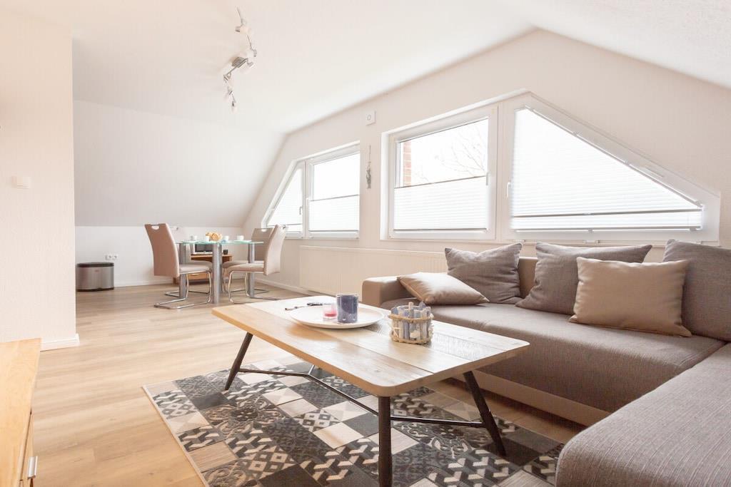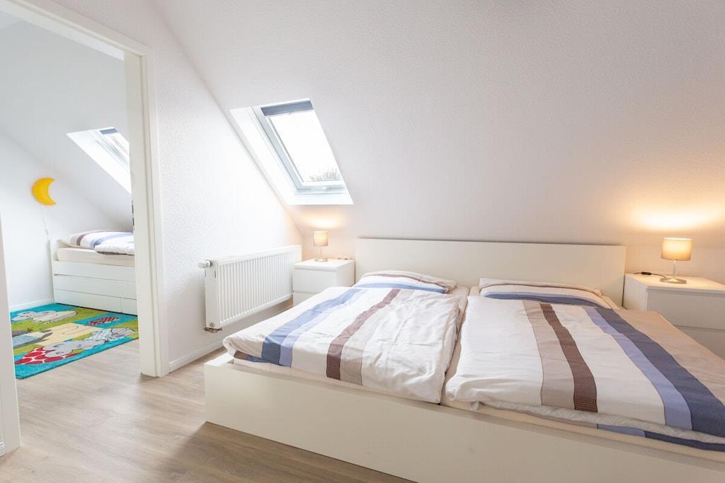 A tastefully furnished and sun-drenched holiday apartment awaits you on the upper floor. The apartment consists of a living/dining area and two bedrooms. A fully equipped fitted kitchen is also available. A large covered terrace with comfortable seating invites you to relax, regardless of the weather. Parking is available directly in front of the house and is included in the price.