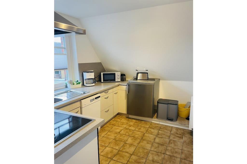 On the 1st floor: (Kitchen(Tea Towels, Kitchenette, hob, electric kettle, toaster, coffee machine, oven, microwave, fridge, freezer), bedroom(Wardrobe, double bed, TV), bedroom(double bed), bathroom(Mirror, toilet, shower, washbasin, hairdryer), guest toilet(Mirror, toilet, washbasin)) Fire Alarm, Hot Water, Internet Access DSL, Internet Access ISDN, Vacuum Cleaner, Internet access, Internet access, balcony(balcony), heating, parking, drying cabinet