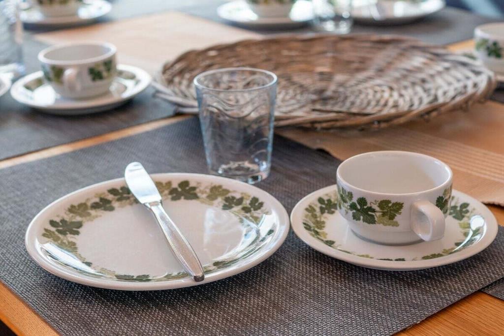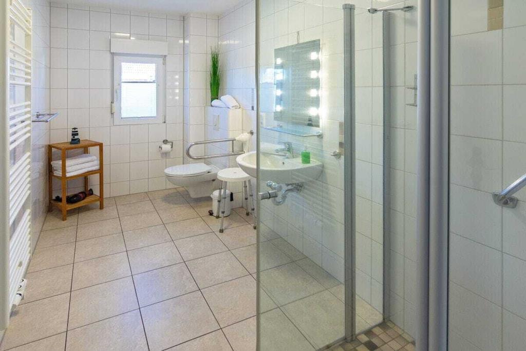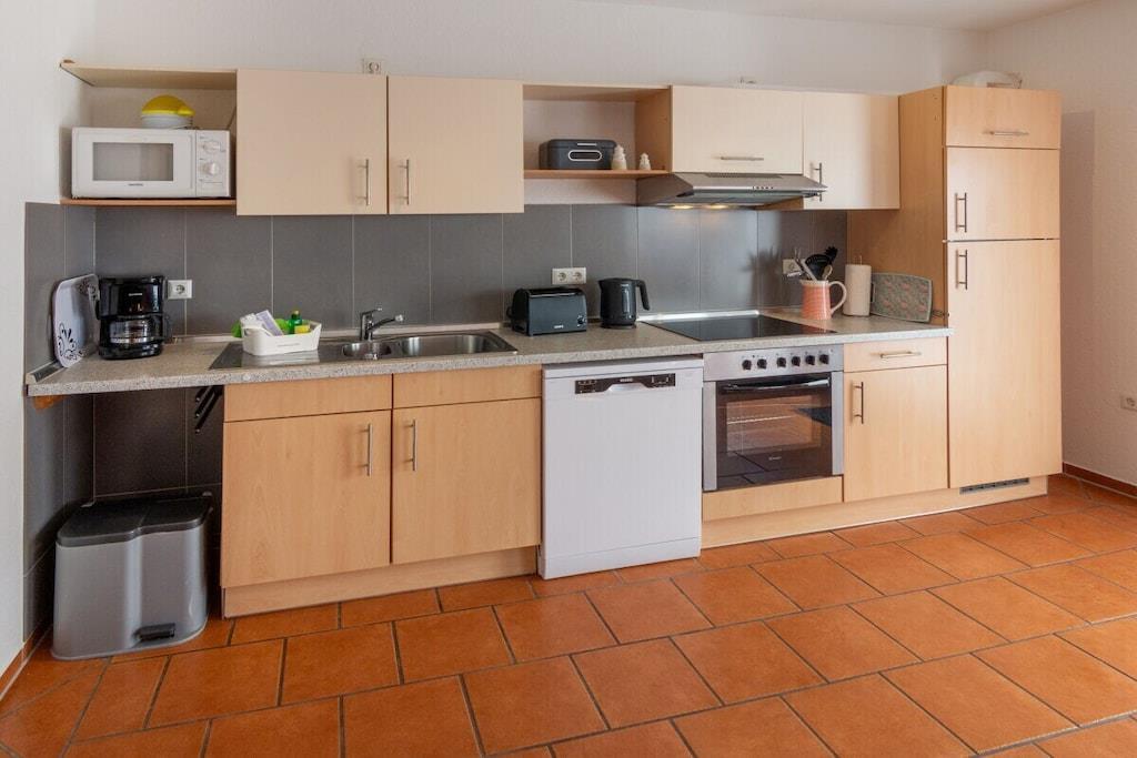 Ground floor: (hallway(Mirror, Wardrobe Coatrack), Kitchen(Egg Cooker, Tea Towels, Kitchenette, dining table, stove, hob, electric kettle, toaster, coffee machine, oven, microwave, dishwasher, fridge, freezer, high chair), Living/diningroom(Games, Sofa, library, TV, dining table, radio), bedroom(Wardrobe, double bed, TV), bedroom(Mirror, Wardrobe, double bed, TV, washbasin), bedroom(Wardrobe, double bed, TV), bathroom(Mirror, toilet, shower, washbasin), bathroom(Mirror, toilet, shower, washbasin), drying room(Vacuum Cleaner, tumble dryer, washing machine, ironing board, iron, drying cabinet)) Fire Alarm, Hot Water, Internet Access DSL, Internet Access ISDN, Vacuum Cleaner, Internet access, Internet access, tumble dryer, washing machine, heating, terrace(Sun Umbrella, garden furniture), garden(Lawn, garden furniture, Garden shed), parking, ironing board, iron, drying cabinet