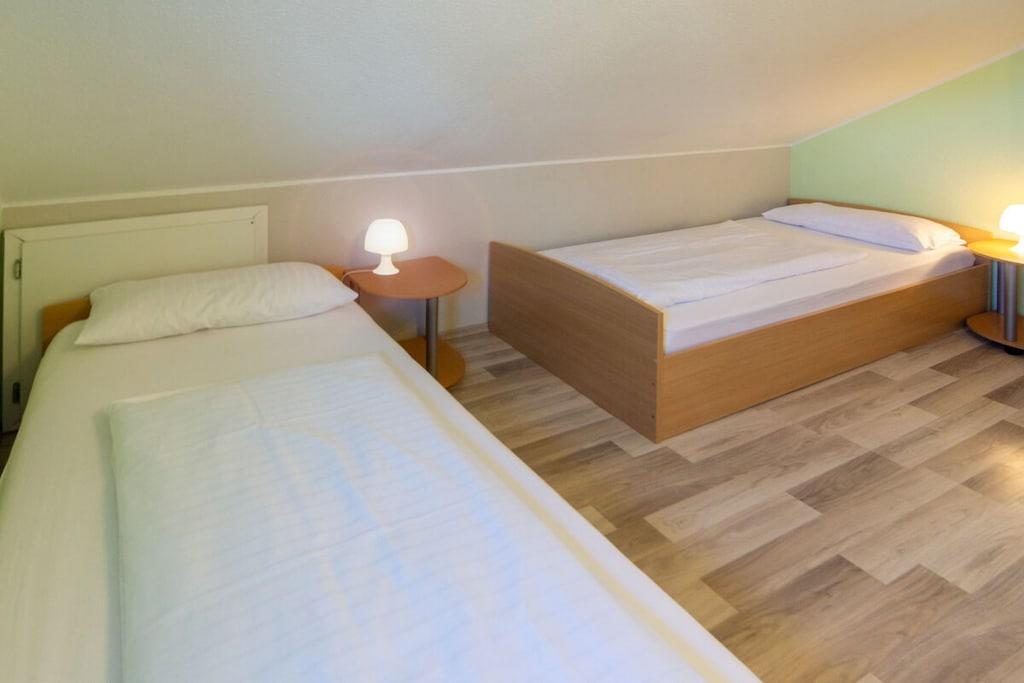 Cozy Upstairs Apartment with Garden Terrace – Perfect for up to 4 People Our lovingly furnished upstairs apartment accommodates up to four people and is ideal for a relaxing vacation. With two comfortable bedrooms, an inviting living room, a fully equipped kitchen, and a modern bathroom, it's the perfect retreat. A special highlight is the garden terrace, available for our guests. Here you can enjoy the fresh air in a relaxed atmosphere and make yourself comfortable with the provided garden furniture. The apartment offers the perfect blend of comfort and coziness – ideal for families, couples, or friends looking for a relaxing getaway.