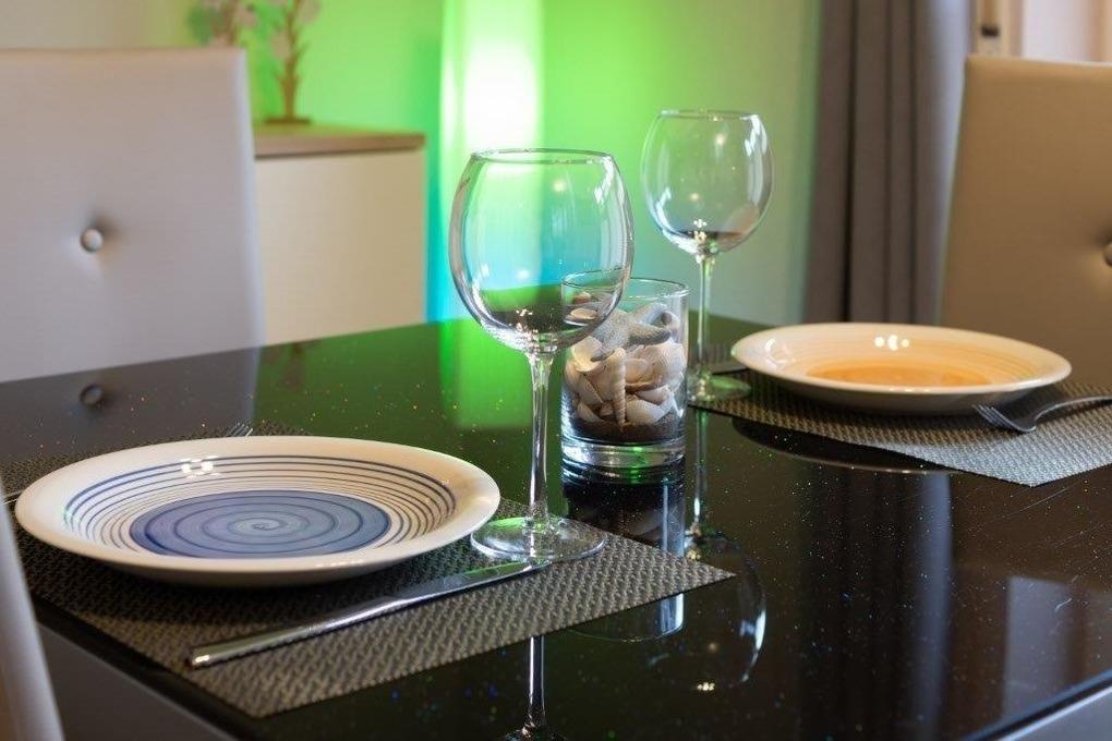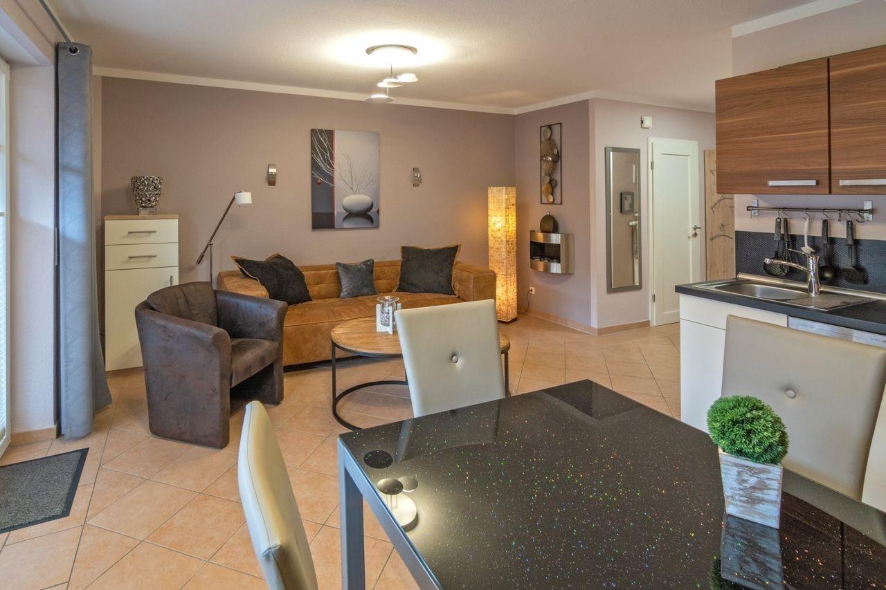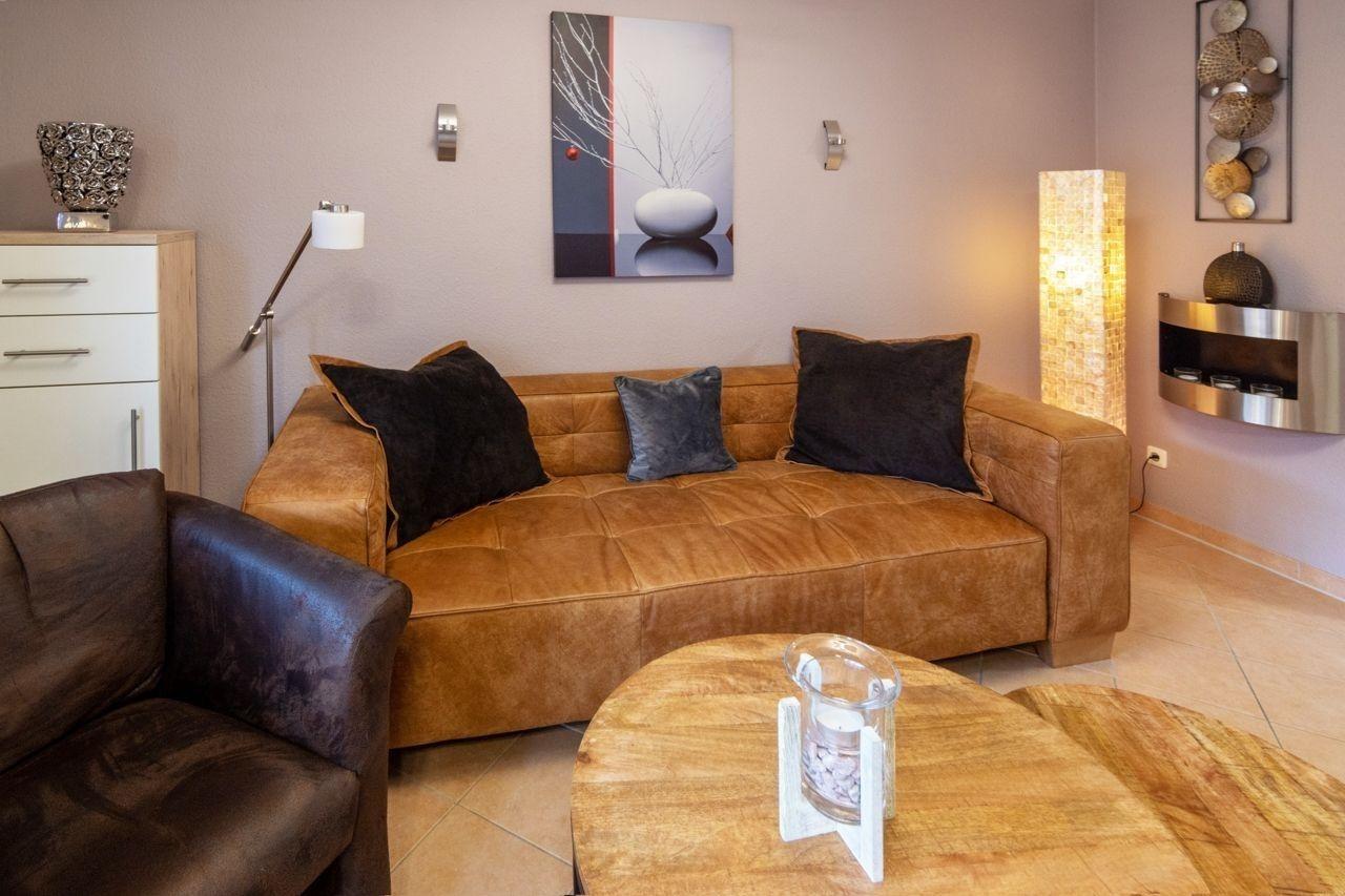 Eine Designer-Couch, ein Sessel mit Beistelltischen sowie der große Flatscreen sorgen für eine ansprechende Möblierung des Wohnbereichs. Der Esstisch bietet genügend Platz für alle Gäste, so dass gemeinsamen Mahlzeiten nichts im Wege steht.