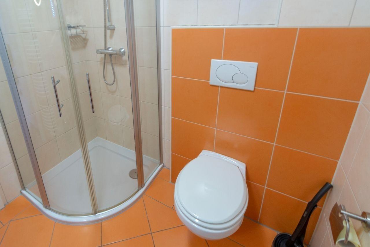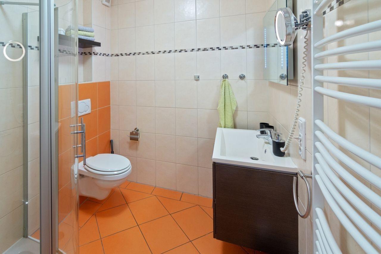 Beim Badezimmer der Unterkunft handelt es sich um ein Duschbad. Ergänzt wird die Ausstattung durch ein WC, eine Waschkombination mit großem Spiegel sowie einen Föhn.