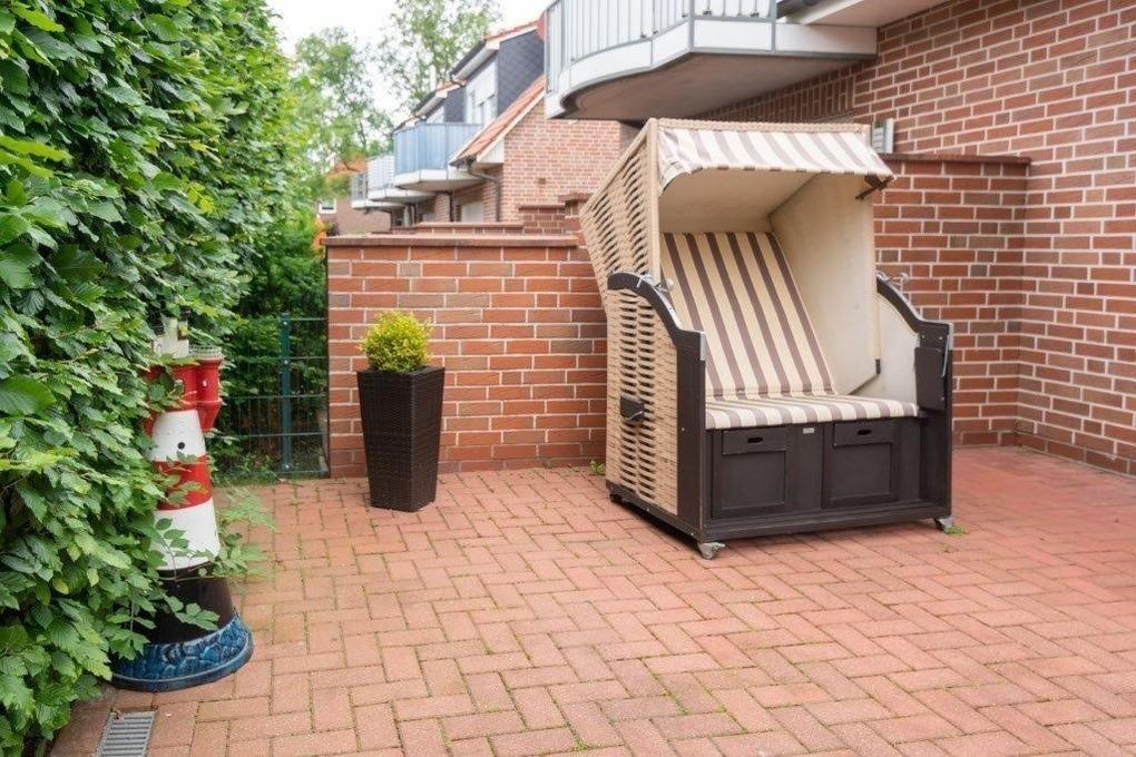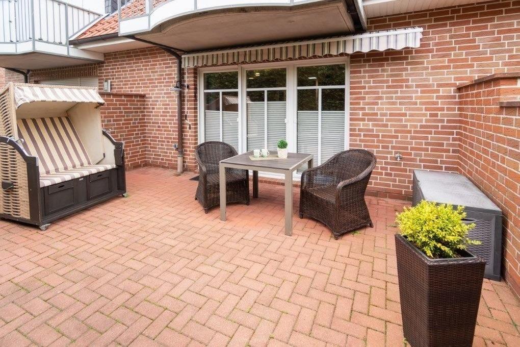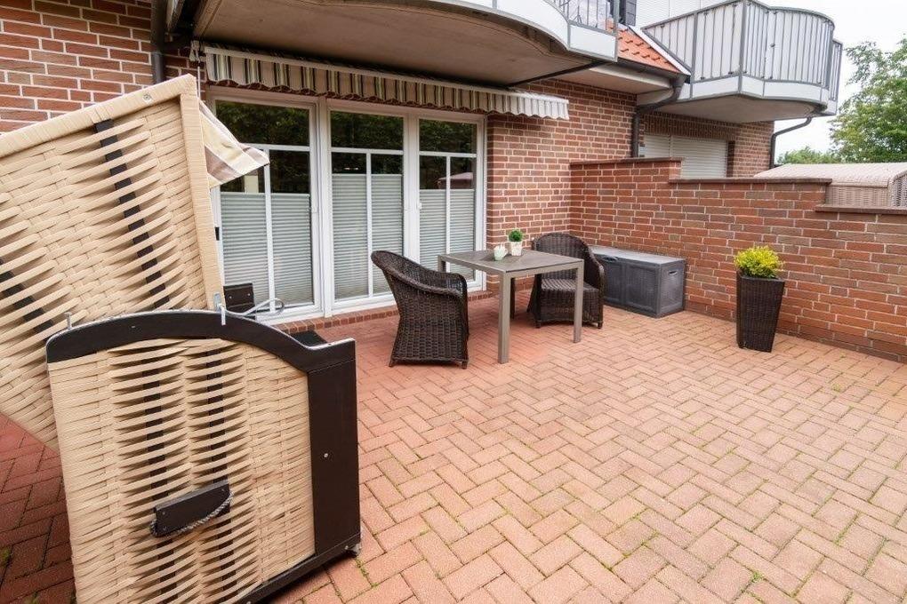 Eine nach Westen ausgerichtete Terrasse lädt in dieser Ferienwohnung dazu ein die Sonne und das schöne Urlaubswetter ausgiebig im Freien zu genießen. Eine Sitzgruppe mit passendem Tisch sowie ein echt nordischer Strandkorb laden zum ausgiebigen Verweilen an der frischen Luft ein. Und davon gibt es in Norddeich reichlich!