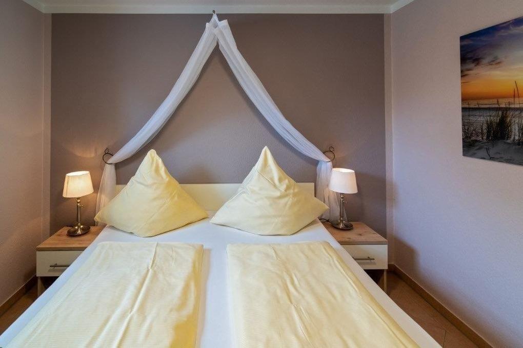 Der separate Schlafraum wurde mit einem großzügigen Doppelbett (200x200cm, getrennte Matratzen) möbliert. Ein angedeuteter Baldachin über dem Bett sorgt für zusätzliche Gemütlichkeit.