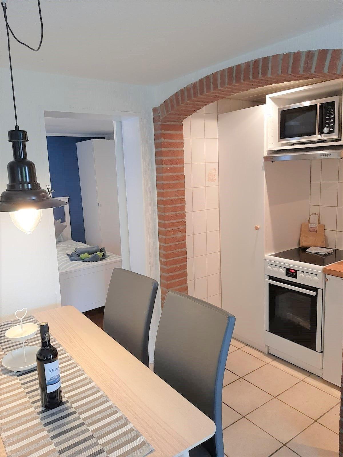 In dieser stilvollen Ferienwohnung erwartet die Gäste ein komfortabler Rückzugsort mit modernem Ambiente. Die Wohnung verfügt über zwei Schlafzimmer, eines mit einem gemütlichen Doppelbett und das andere mit zwei Einzelbetten, ideal für Familien oder Gruppen. Die offene Küche ist mit einem Elektro- und Gasherd, Backofen, Mikrowelle, Kühlschrank und Gefriermöglichkeit ausgestattet und bietet alles, was für die Zubereitung von Mahlzeiten benötigt wird. Ein Esstisch schafft den perfekten Rahmen für gemeinsame Dinner. Das Badezimmer, lichtdurchflutet durch ein Fenster, ist mit hochwertigen Annehmlichkeiten ausgestattet. Der Wohnbereich lädt mit einem Sofa und Sessel zum Entspannen ein. Zur weiteren Ausstattung gehören WLAN, TV und eine Heizung für wohlige Wärme. Allergikerfreundliche Materialien sorgen für ein gesundes Wohnklima. Ein Parkplatz ist ebenfalls vorhanden, was die Anreise bequem gestaltet.