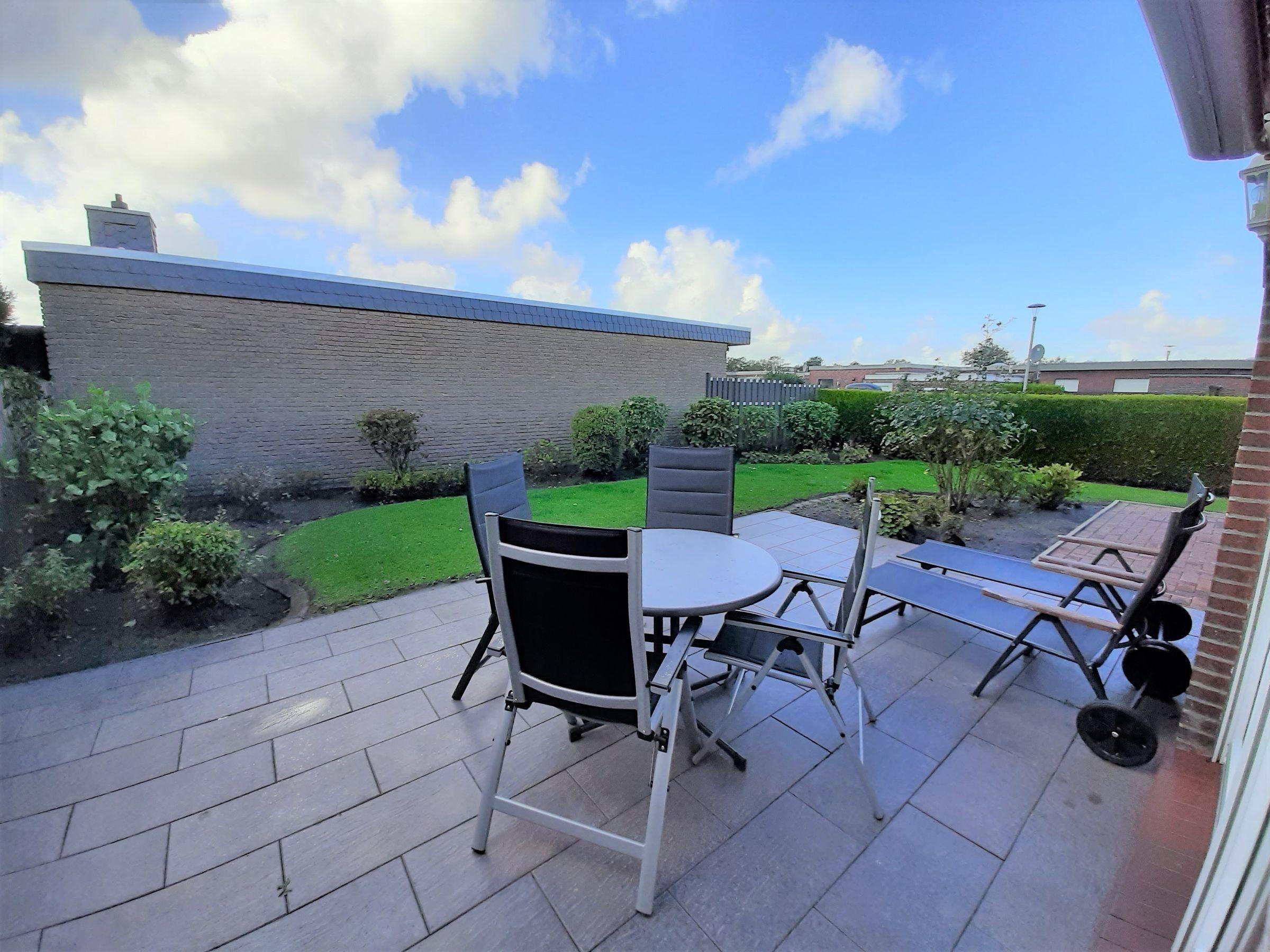 Die Ferienwohnung bietet einen eigenen Garten mit einer einladenden Liegewiese. Gäste können sich auf der großzügigen Terrasse entspannen, die mit bequemen Gartenliegen und Liegestühlen ausgestattet ist. Eine Markise sorgt für angenehmen Schatten. Hier lässt sich der Urlaub in privater Atmosphäre genießen und die Seele baumeln lassen.