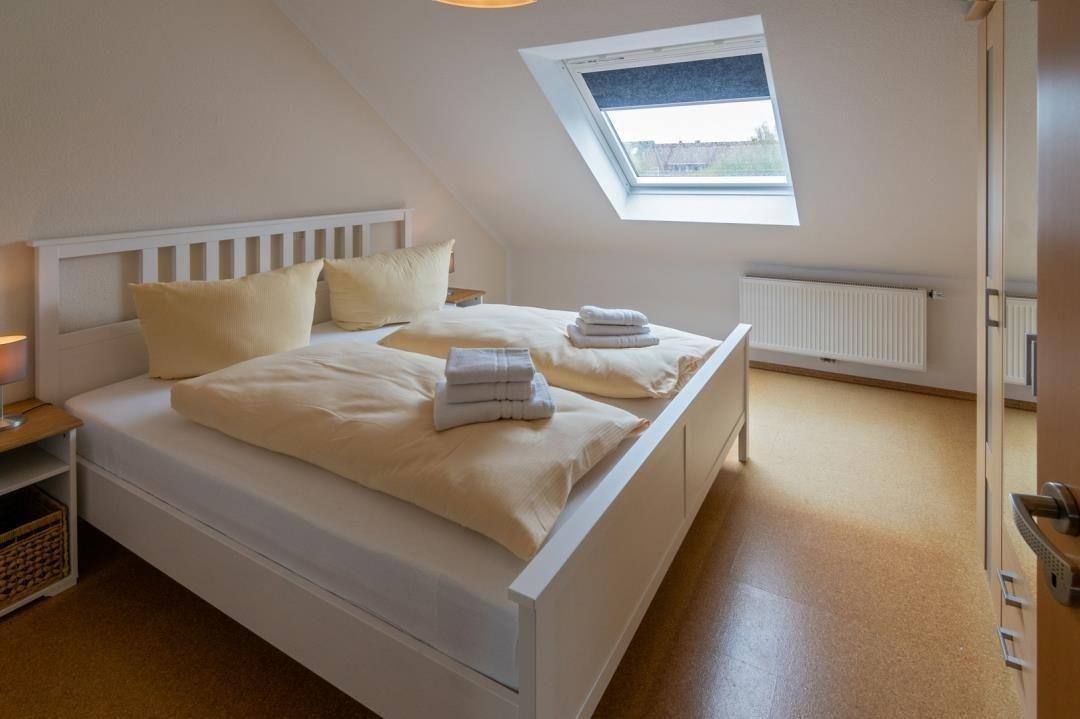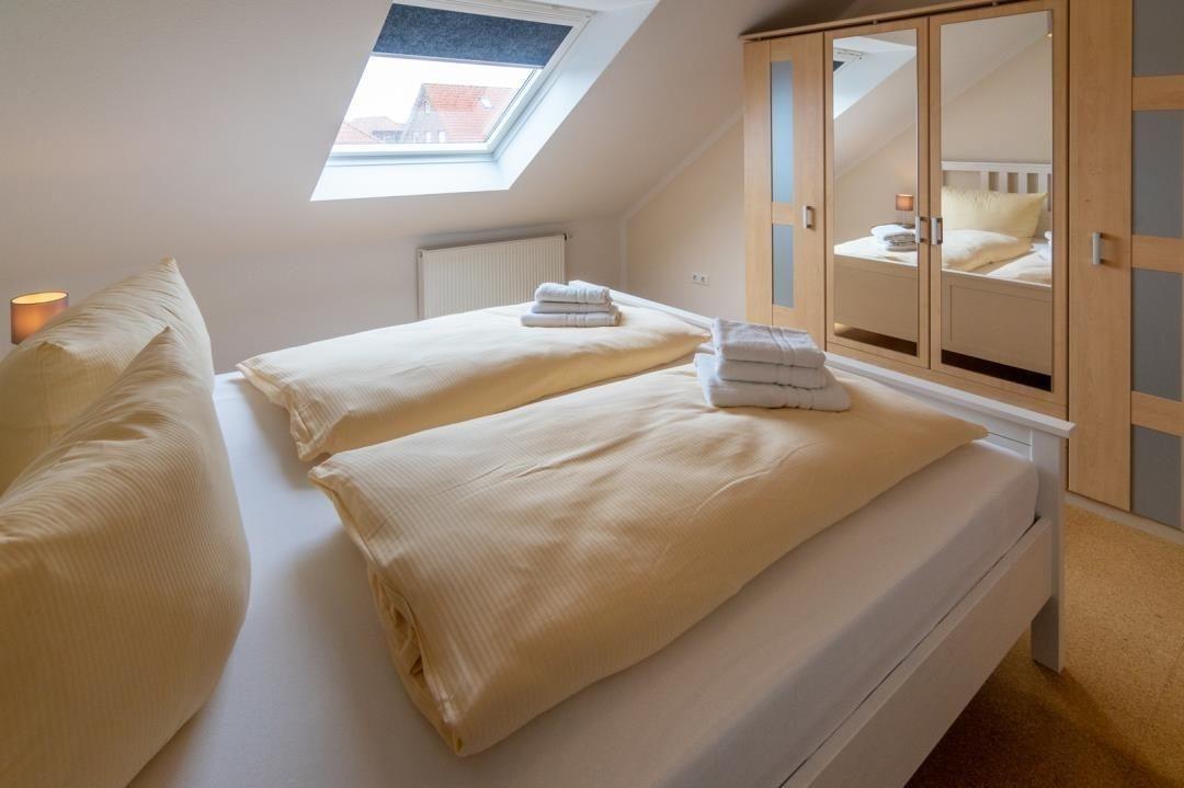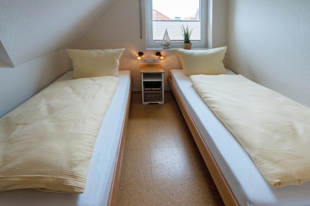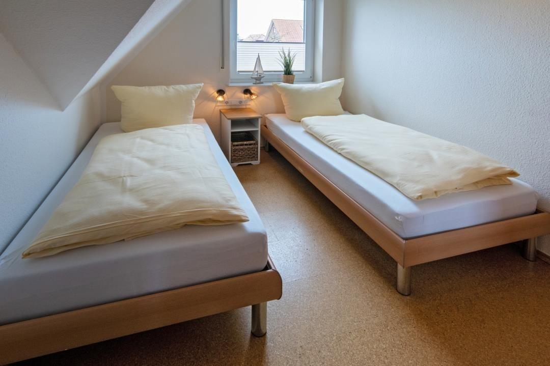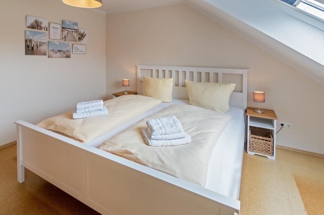 Nur wenige Meter hinter den Dünen erwartet sie die Ferienwohnung Küstenbrise, die sich über zwei Etagen erstreckt. Platz finden Sie hier mit der großen Familie oder mit einem netten Freundeskreis. Die Wohnung ist am besten geeignet für vier bis sechs Personen. Dazu stehen Ihnen drei Schlafzimmer zur Verfügung. Alle Schlafräume sind freundlich und hell eingerichtet – eine gelungene Kombination aus modernem Einrichtungsstil und norddeutschem Landhaus-Charme. Sie werden alles sehr gepflegt und in bestem Zustand vorfinden. Das Elternschlafzimmer im Obergeschoss des Ferienhauses besitzt ein Doppelbett sowie einen sehr geräumigen Kleiderschrank. Auf gleicher Etage ist das zweite Schlafzimmer zu finden, das mit zwei Einzelbette ausgestattet ist. Über eine schmale Holztreppe gelangen Sie ins Dachgeschoss, der zweiten Etage Ihres Feriendomizils. Hier befindet sich ein kuscheliger Schlafraum mit zwei Einzelbetten. Zwar bietet Ihnen diese Koje unter dem Dach nicht viel Platz, wirkt dafür jedoch umso gemütlicher.