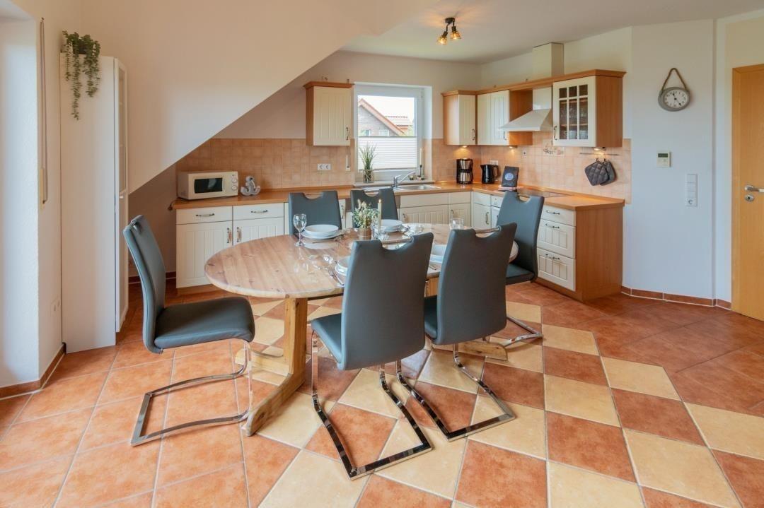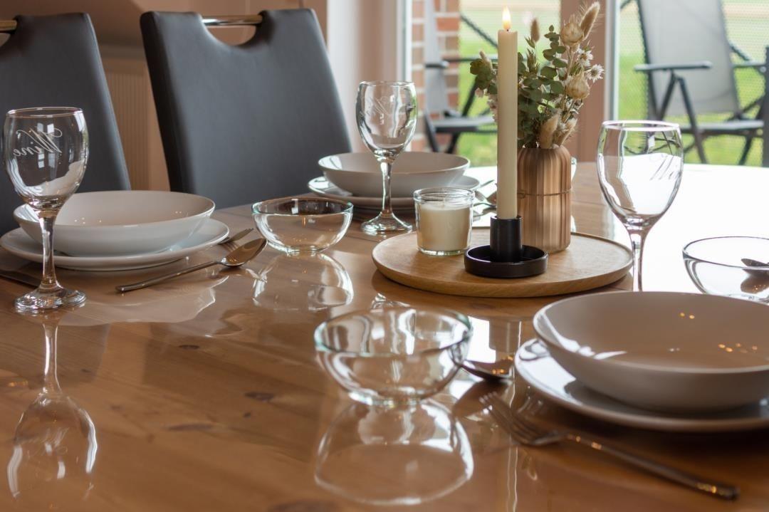 Platz für alle ist ausreichend im Wohn- und Essbereich vorhanden. Die offene Küche wirkt hell und einladend – ideal, um gemeinsam zu kochen, wenn Ihnen nicht nach einem Restaurantbesuch ist. Auch im Wohnbereich wurde mit viel Geschmack ein Mix aus Landhauscharme und Moderne umgesetzt. Einen tollen Kontrast zur Küche bietet hier die moderne, aber gemütliche Essecke mit dem ovalen Holztisch und den bequem gepolsterten Freischwinger-Stühlen. Sechs Personen finden hier Platz, direkt vor der großen Fensterfront, die Blick über die ebene Landschaft gewährt.