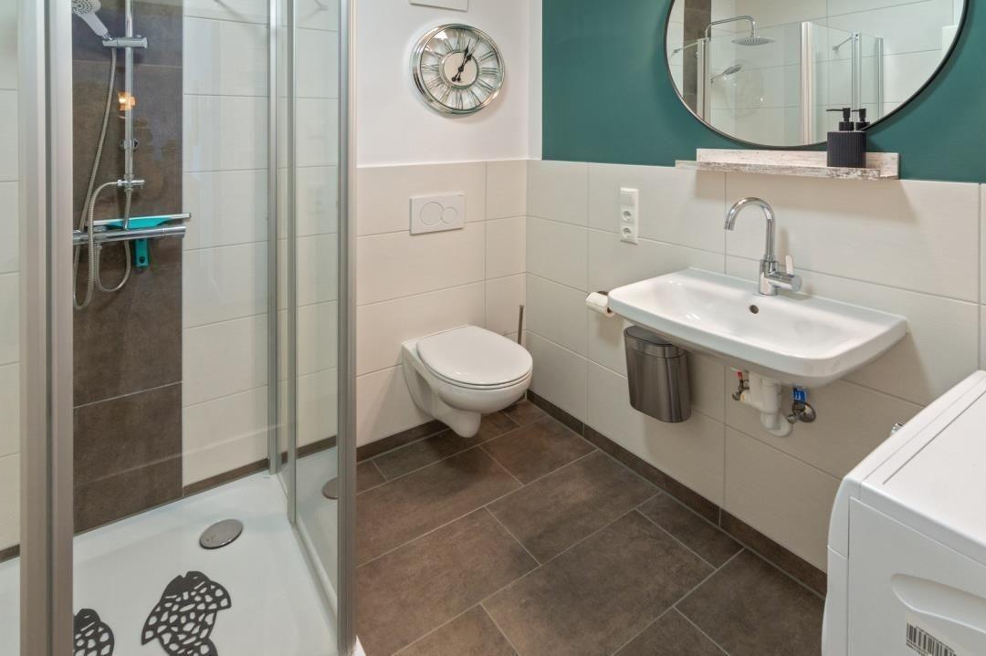 Das große Badezimmer hat kein Fenster, eine bodennahe Dusche, WC + Spiegel mit Unterschrank. Die Waschmaschine steht hier.