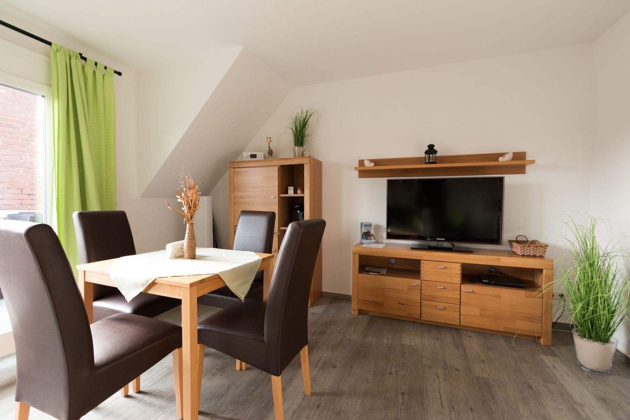 Die Ferienwohnung bietet einen idyllischen Gartenblick und ist ideal für Familien und Gruppen bis zu vier Personen, perfekt gelegen für entspannte Auszeiten und aufregende Abenteuer in Norddeich.