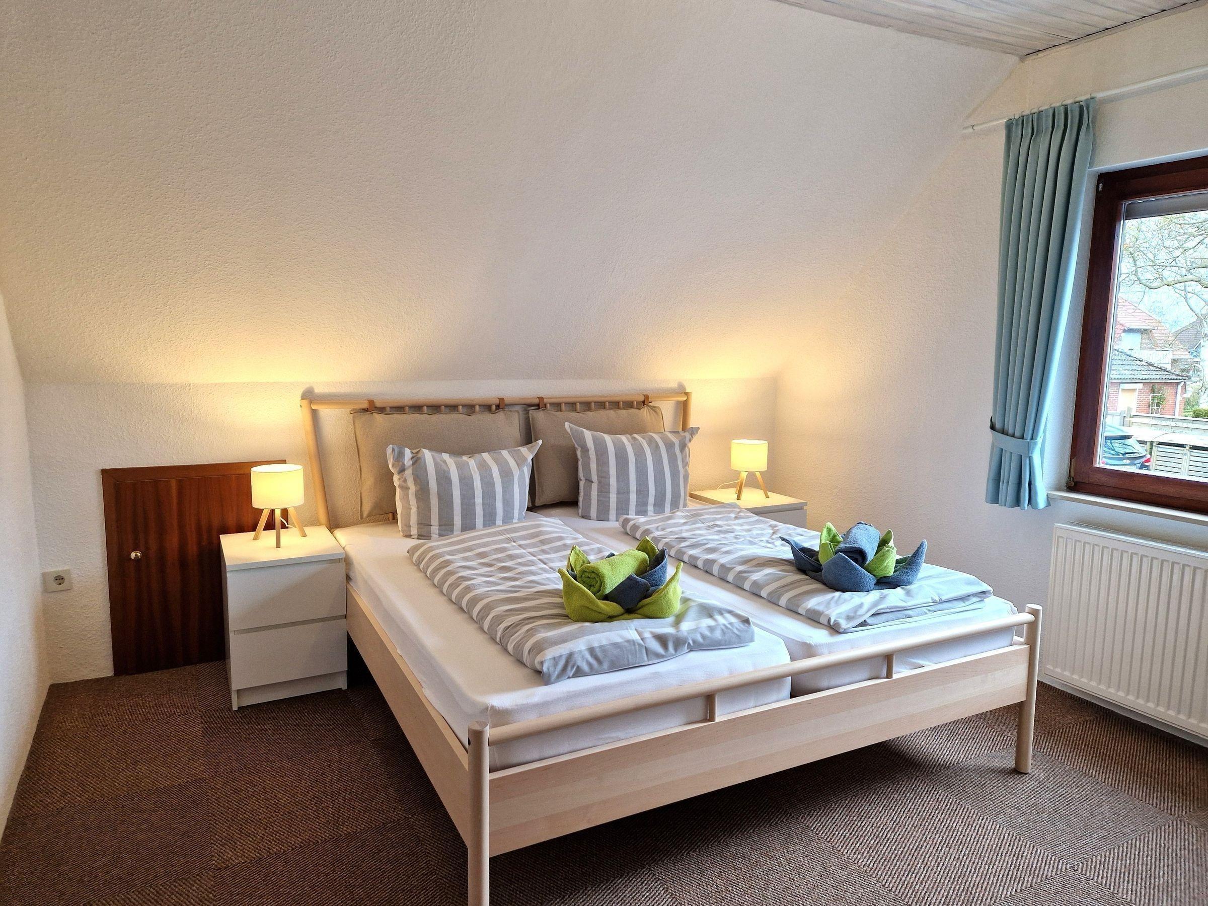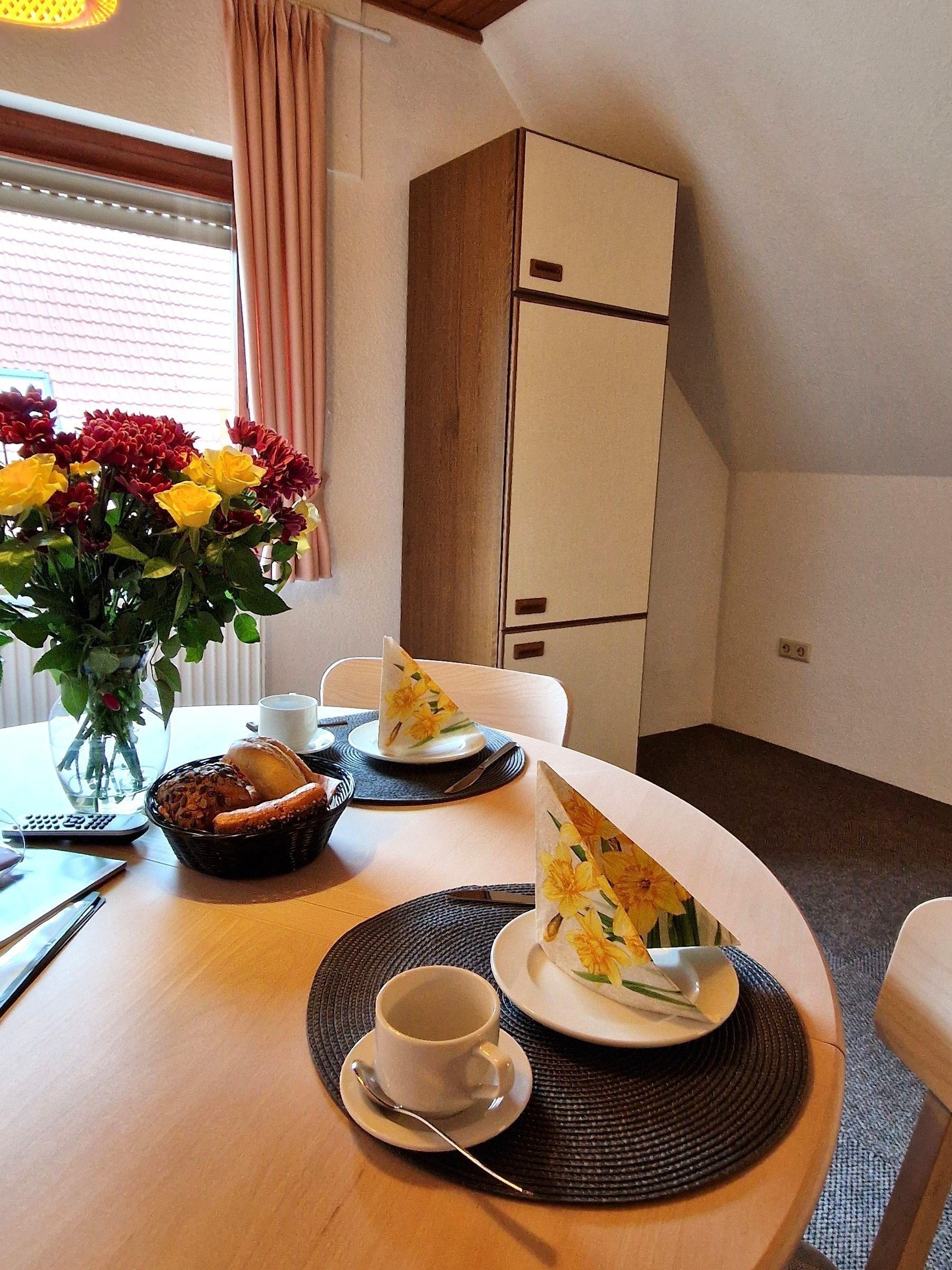 Die Ferienwohnung bietet eine komfortable Unterkunft mit zwei Schlafzimmern, in denen ein Doppelbett und zwei Einzelbetten Platz finden. Sie ist allergikergeeignet und ausgestattet mit einem Duschbad, das mit einem Fenster für frische Luft sorgt. Der Wohnbereich lädt mit einem Sofa und einem Sessel zum Entspannen ein, während die HiFi-Anlage und der TV für Unterhaltung sorgen. In der separaten Küche stehen ein Elektro-/Gasherd, Backofen, Mikrowelle, Kühlschrank mit Gefriermöglichkeit sowie eine Kaffeemaschine, ein Toaster und ein Wasserkocher zur Verfügung. Geschirr und Besteck sind ebenfalls vorhanden. Ein Esstisch bietet ausreichend Platz für Mahlzeiten. Ein kostenloser Parkplatz ist vorhanden, und WLAN sorgt für Internetzugang. Heizung, Staubsauger und ein Wäscheständer runden die Ausstattung ab. Die Wohnung bietet somit alles für einen entspannten Aufenthalt.