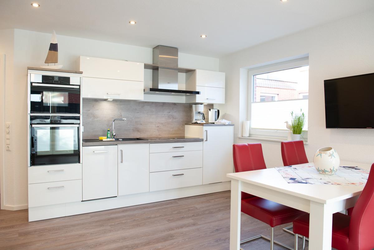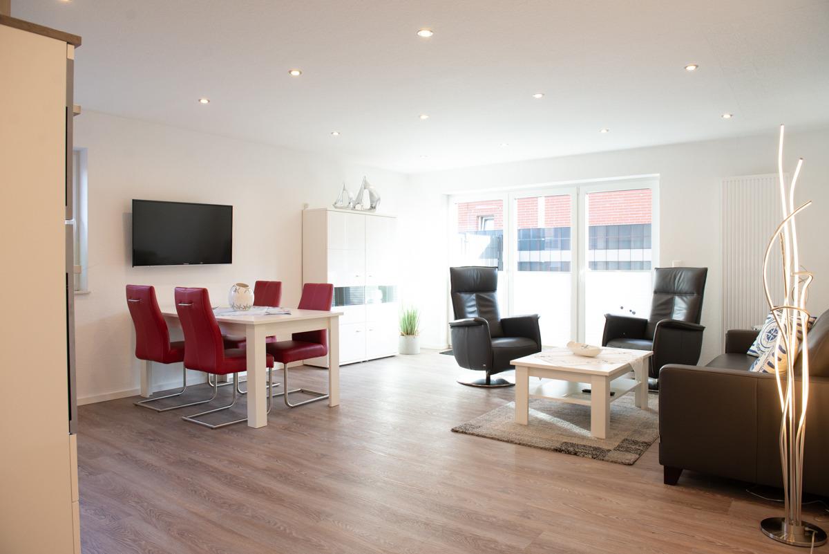 Die Ferienwohnung Deichnähe G liegt im Erdgeschoss, durch die große, moderne Diele mit Garderobe und heller Beleuchtung gelangen Sie in das Wohn/Esszimmer, das mit einer gemütlichen Couch und 2 Relaxsessel, einer kompletten Essgruppe und einer voll ausgestatteten Einbauküche eingerichtet ist.