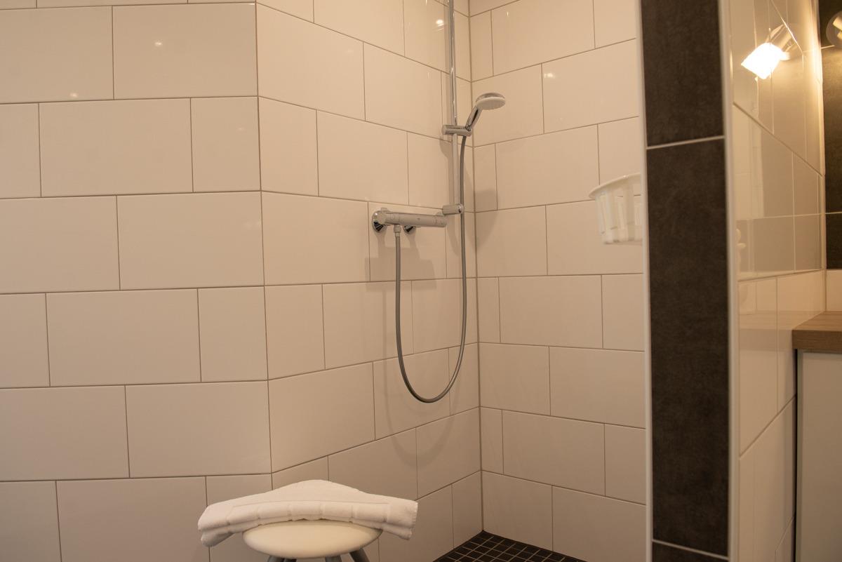 Das moderne große Bad/WC mit Fenster verfügt über eine bodenebene Dusche, WC, Waschtischkombination, Föhn, Hocker, Kosmetikspiegel u.v.m.