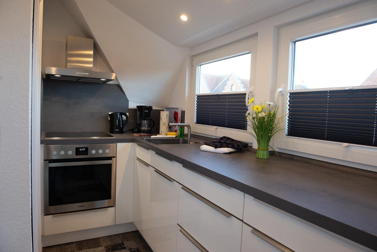 Diese charmante, liebevoll eingerichtete Ferienwohnung im 2. Obergeschoss bietet auf ca. 30 m² alles, was Sie für einen entspannten Aufenthalt benötigen. Ideal für 1–2 Personen, verfügt die Wohnung über ein 150 cm breites Bett, eine gemütliche Sitzecke mit zwei Stühlen und eine voll ausgestattete Einbauküche mit Backofen.