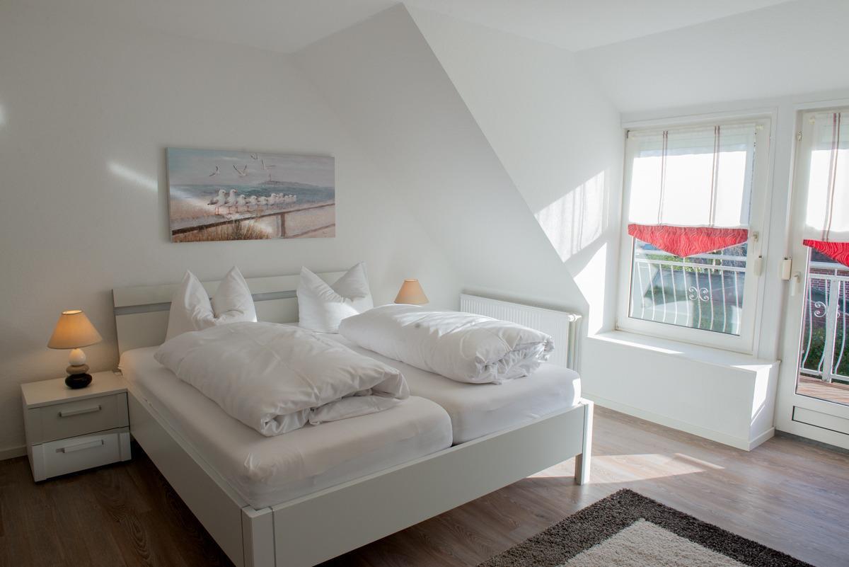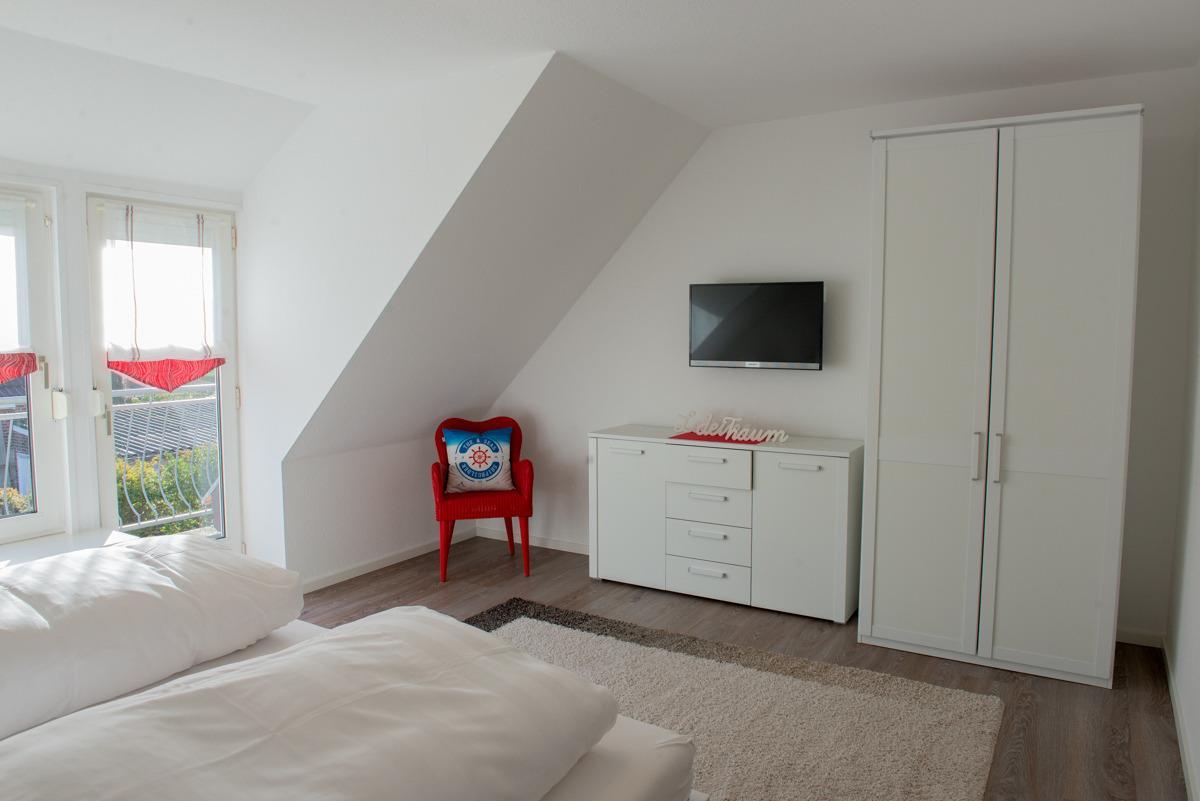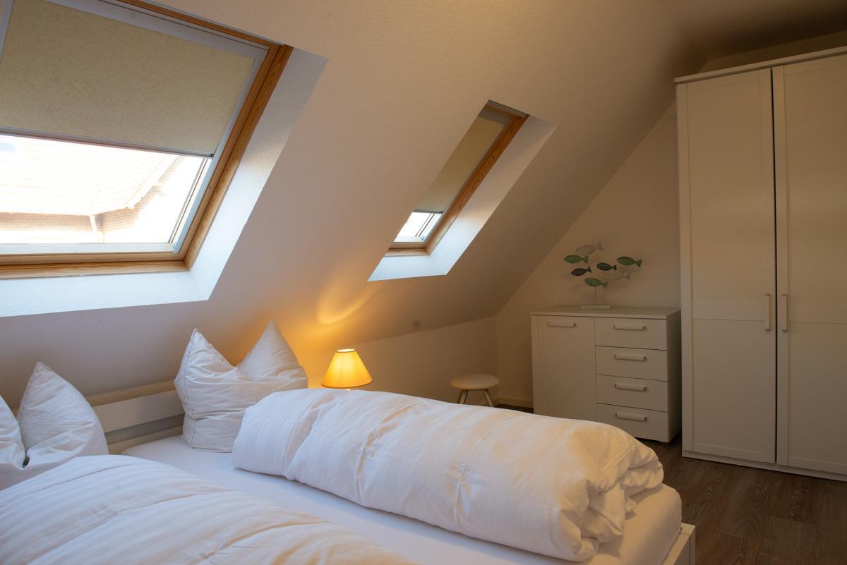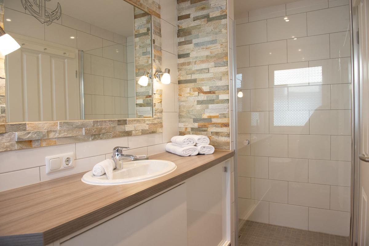 Die großzügige Ferienwohnung Mitschip erstreckt sich über zwei Etagen und bietet zwei separate Schlafzimmer im 1. Obergeschoss, eines davon mit Außenrollläden und Sat-TV. Zusätzlich steht Ihnen dort ein separates WC zur Verfügung. Das moderne Badezimmer ist mit Tageslicht, einer bodenebenen Dusche und einem Handtuchheizkörper ausgestattet.