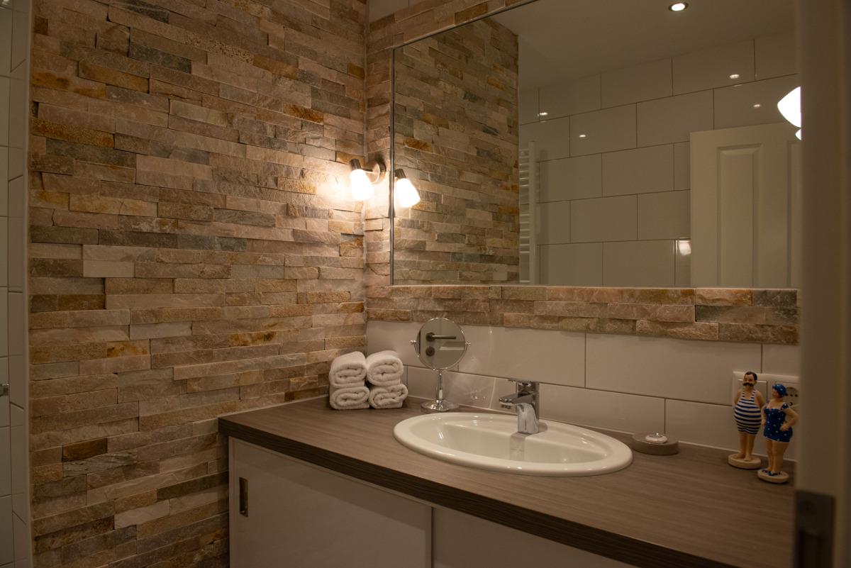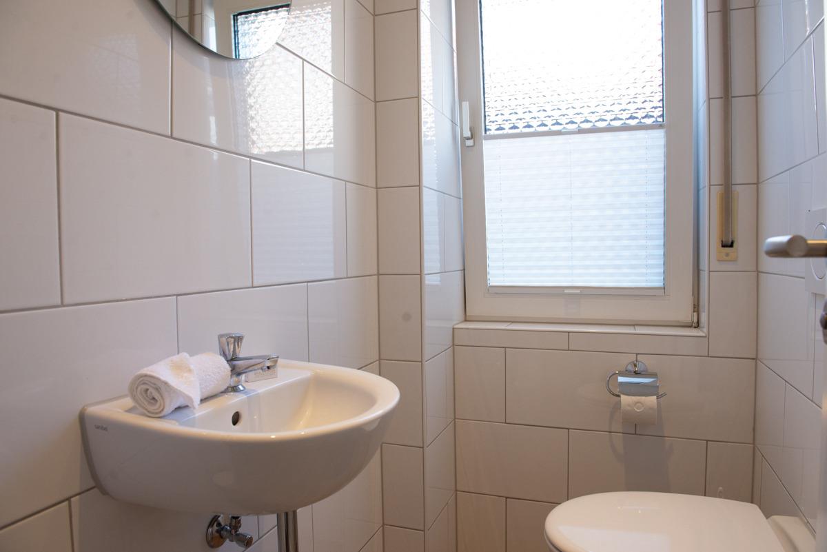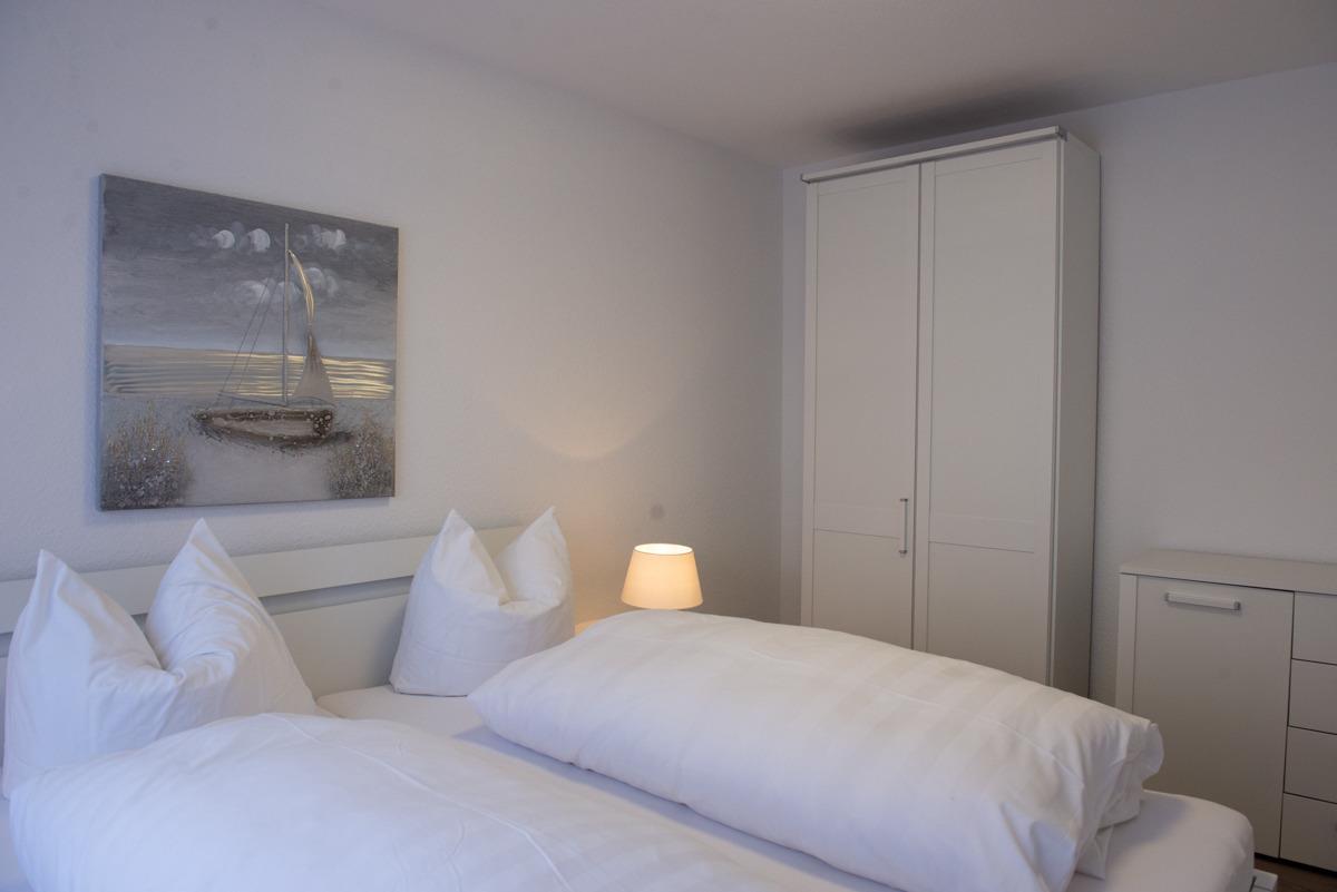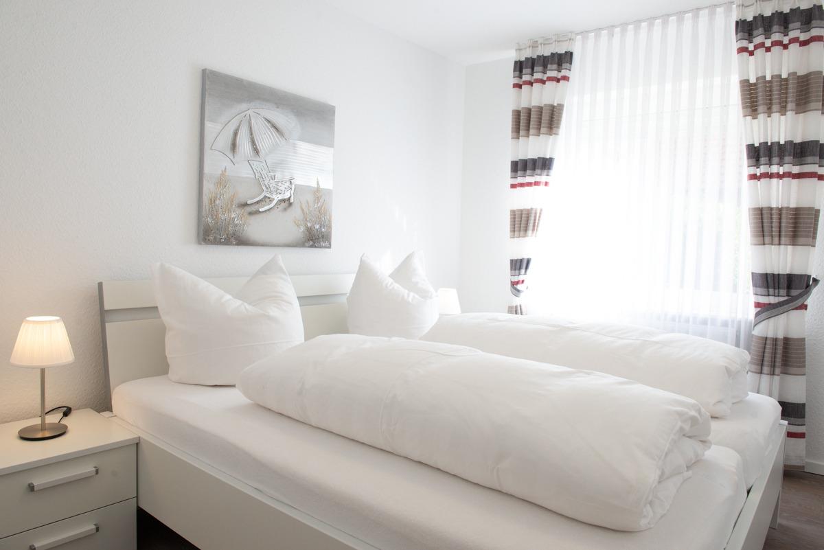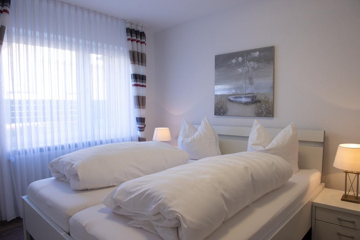Die Ferienwohnung Olivia im Erdgeschoss bietet zwei separate Schlafzimmer mit Außenrollläden, eines davon mit Sat-TV. Das WC ist separat, das moderne Bad verfügt über ein Fenster, eine bodengleiche Dusche und einen Handtuchheizkörper.