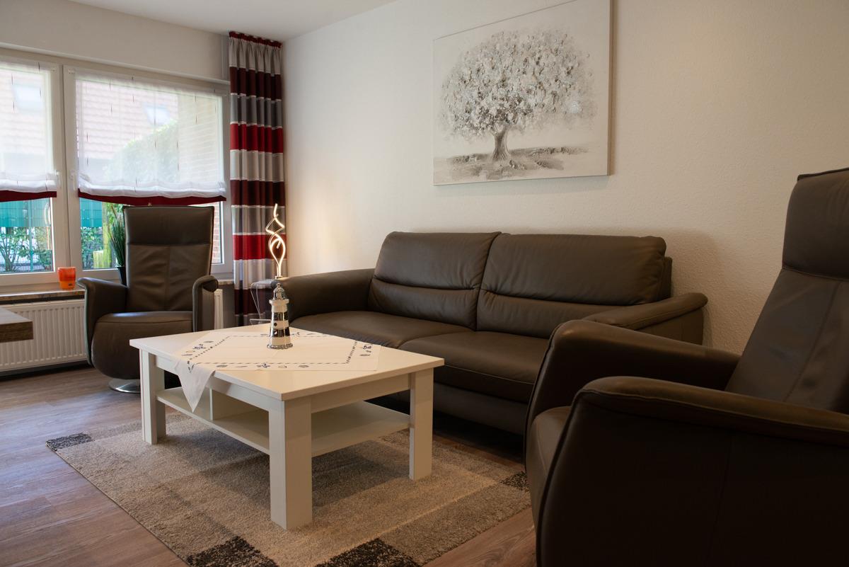 Der helle Wohn-Essbereich lädt mit einem Esstisch für vier Personen, einer gemütlichen Couch, zwei Relaxsesseln und einem Sat-TV zum Verweilen ein. Von hier aus gelangen Sie auf die teilweise überdachte Terrasse mit kleiner Rasenfläche.