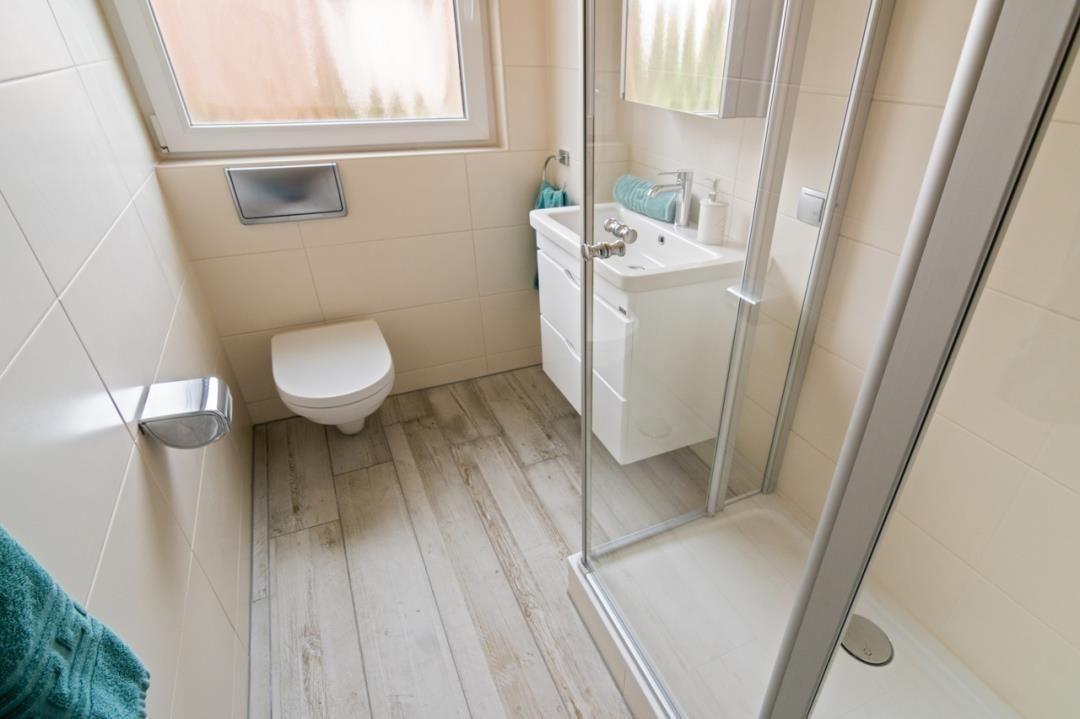 Das Badezimmer ist mit einer Dusche, einem WC sowie einer Waschkombination mit Spiegel ausgestattet. Die Waschmaschine steht im Gemeinschaftswaschraum des Hauses und darf gerne genutzt werden.
