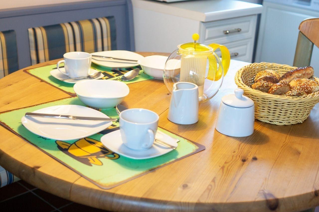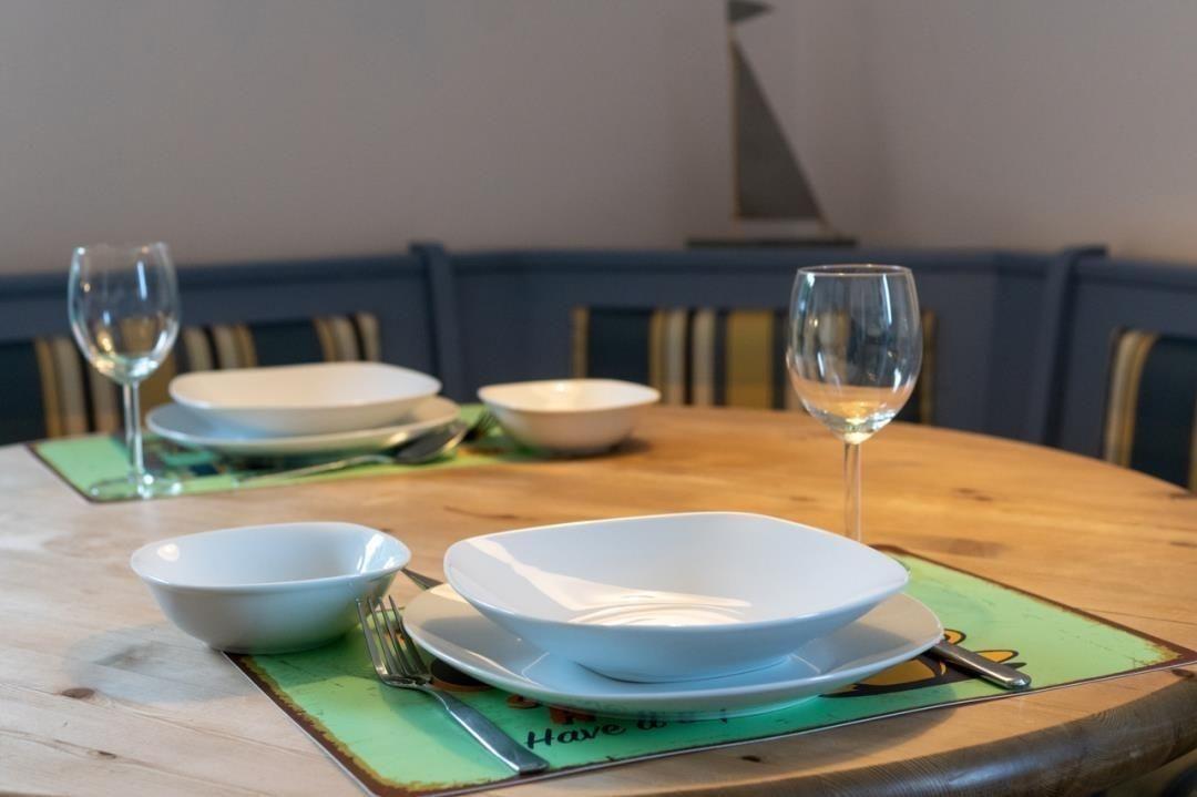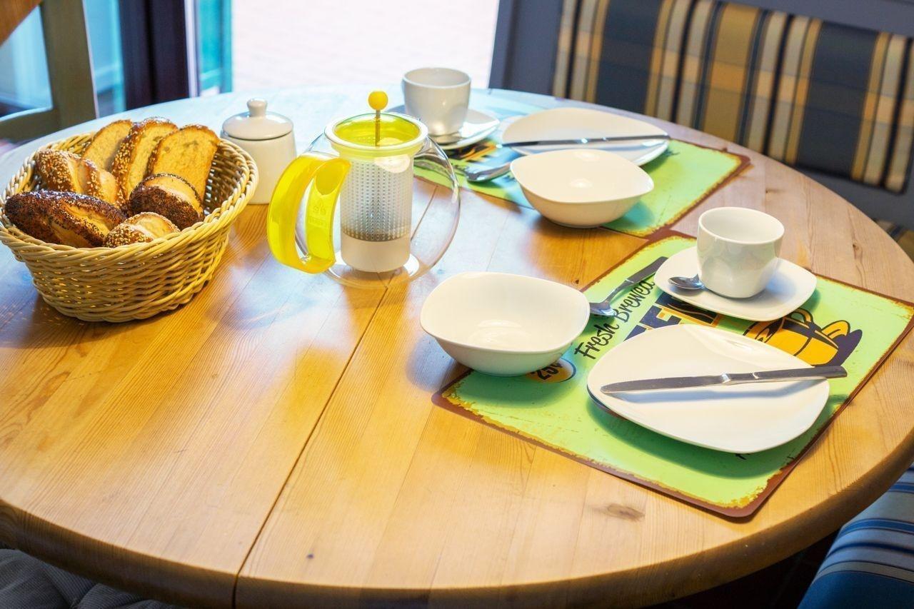 In der kompakt und funktional eingerichteten Küche finden Sie alles, was Sie zum Zubereiten Ihrer Speisen benötigen. Die Ausstattung beinhaltet einen Herd mit Backofen, eine Kaffeemaschine, eine Padmaschine, einen Kühlschrank, eine Mikrowelle sowie einen Geschirrspüler. Zudem finden Sie hier Toaster, Eierkocher, Mixer und selbstverständlich ausreichend Geschirr, Gläser und Besteck. Hier wird es Ihnen an nichts fehlen. Ihre Mahlzeiten können Sie direkt in der angeschlossenen Sitzecke einnehmen.