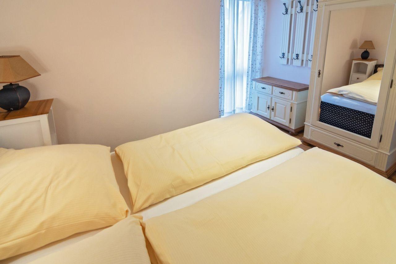 Die Ferienwohnung verfügt über ein gemütliches kleines Schlafzimmer, welches mit einem 160 x 200 cm großen Doppelbett mit separaten Matratzen und einem kleinen Kleiderschrank ausgestattet ist. Ihre übrige Garderobe und weitere Utensilien lassen sich zudem im praktischen Wandschrank im Wohnbereich verstauen.