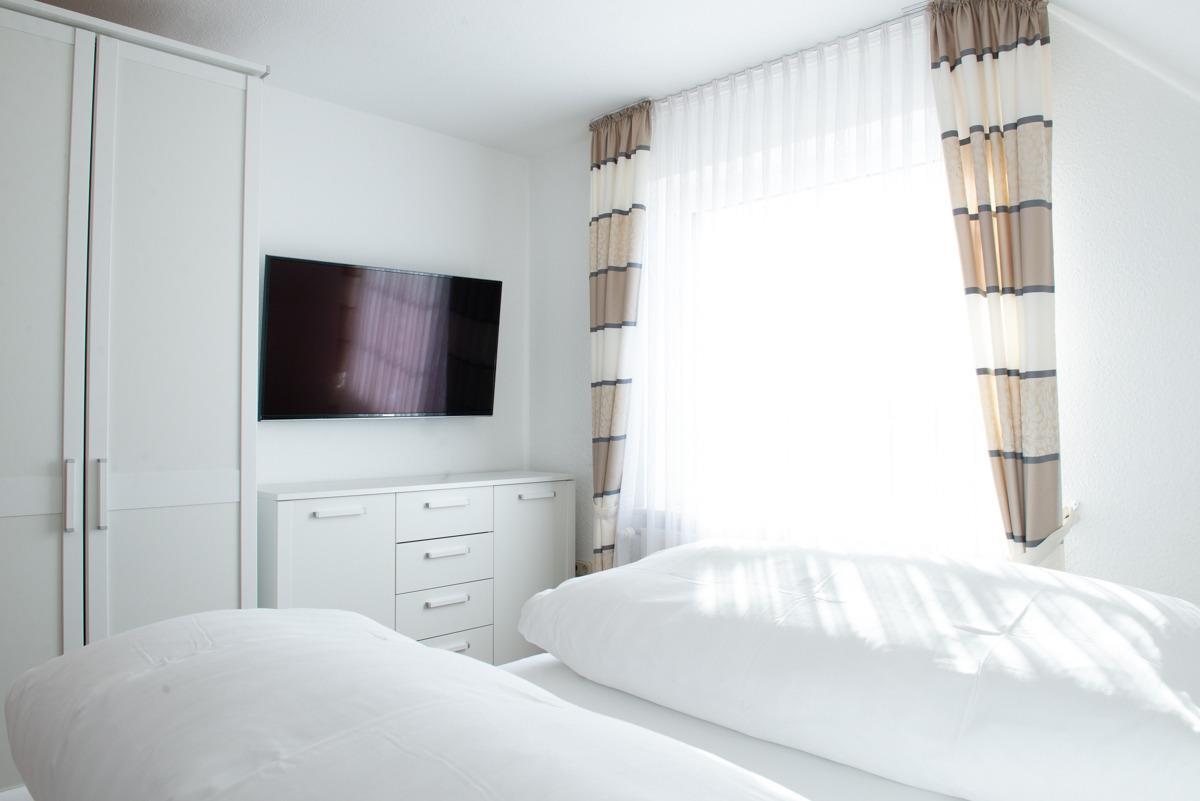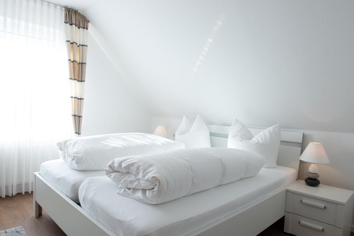 Zwei getrennte Schlafzimmer mit je einem Doppelbett, wo ein Schlafzimmer mit Außenrolläden und Sat/TV, das zweite Schlafzimmer mit einem Veluxfenster ausgestattet ist.