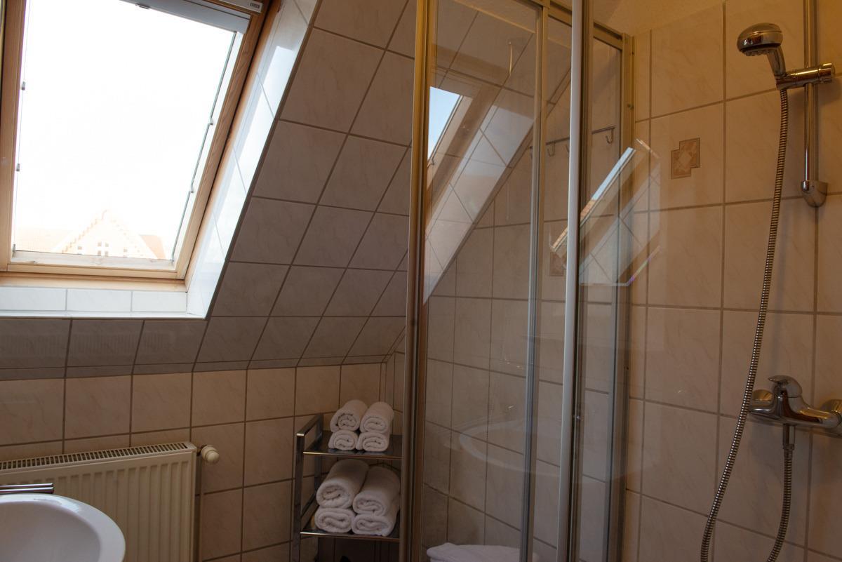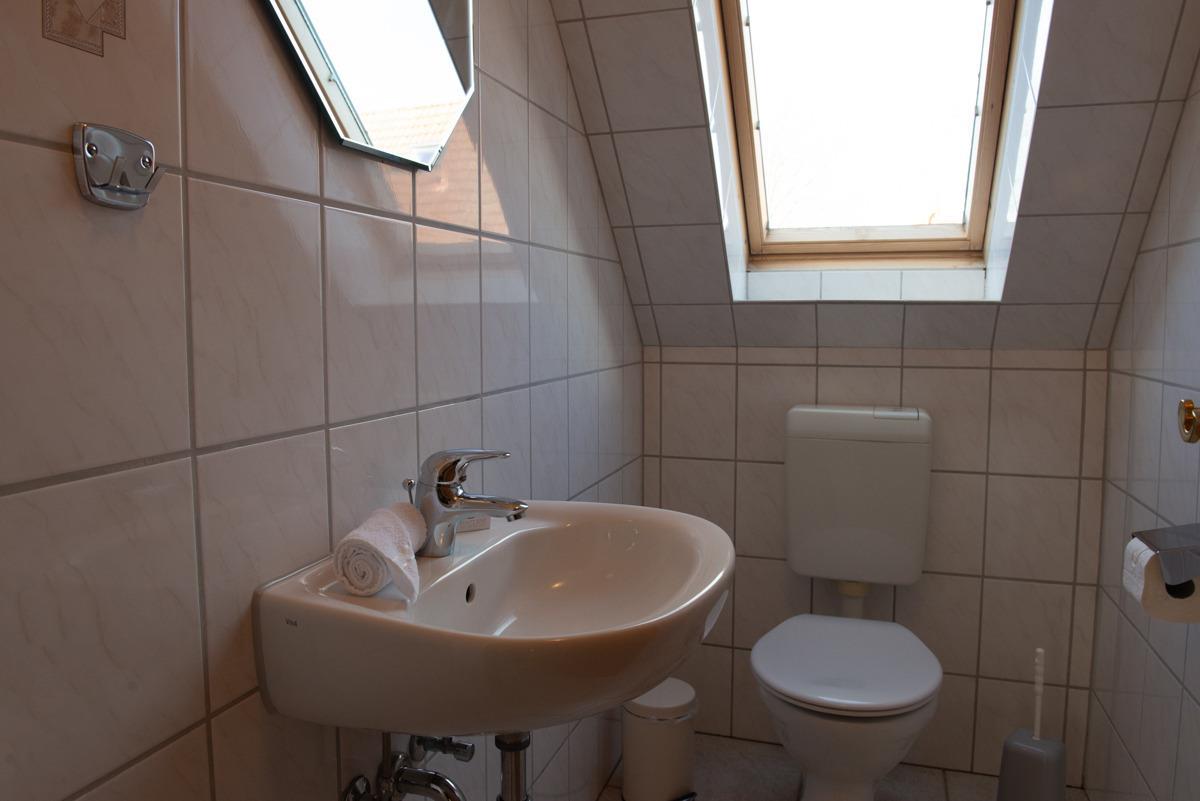 Das Bad ist mit einer Dusche und Waschbecken ausgestattet. Das WC ist separat.