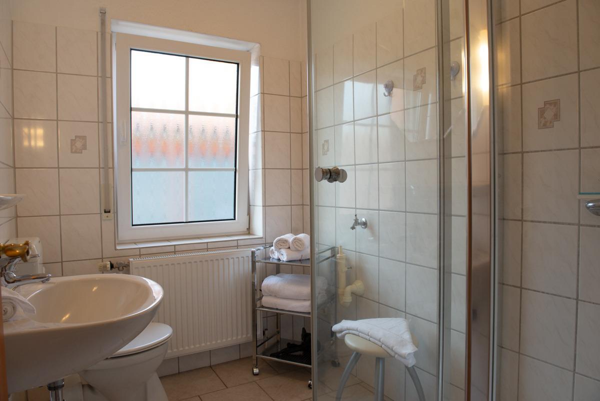 Das Bad ist mit einer Dusche und einem Waschbecken ausgestattet. Das WC ist separat.