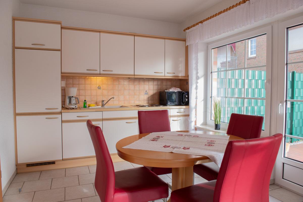 Die Ferienwohnung Rotbuche 3 ist komplett ebenerdig, Das Wohn-Esszimmer ist mit Sat/TV, einer gemütlichen Couch und Sessel ausgestattet und hat einen Zugang zur eingezäunten Terrasse. Durch einen gemauerten Rundbogen kommt man zur vollausgestatteten Küche mit einer Essgruppe und ebenfalls einen Durchgang zur Terrasse.