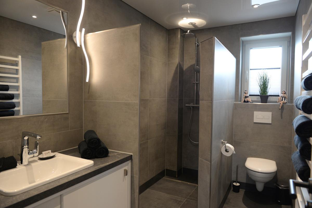 Das moderne Badezimmer mit Fenster verfügt über eine bodenebene Dusche, einem WC, eine Waschtischkombination mit großem Spiegel, Föhn usw.