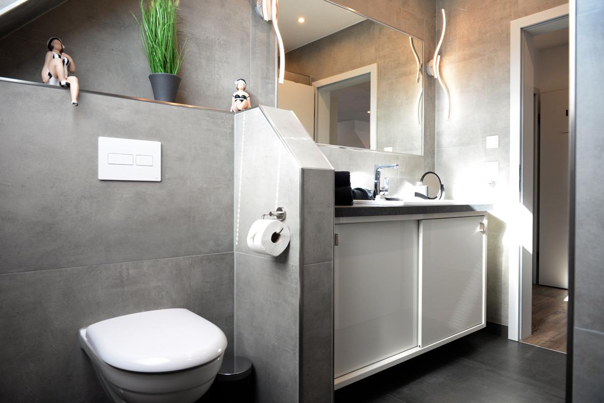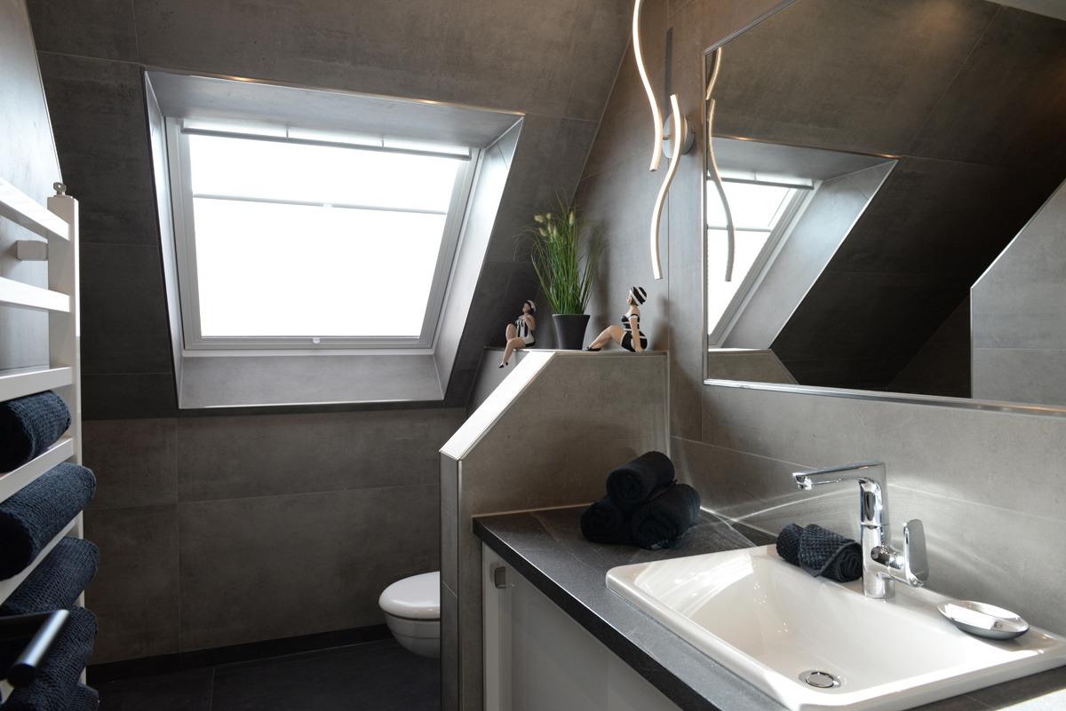 Das moderne Badezimmer mit Veluxfenster verfügt über eine bodenebene Dusche, einen WC, eine Waschtischkombination mit großem Spiegel, Föhn usw.