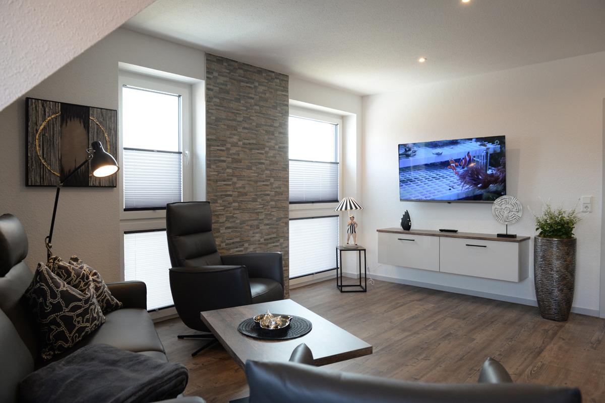 Die Ferienwohnung Deichdeck 1 OR für 2 Personen befindet sich im 1. OG eines neu erbauten Ferienhauses mit insgesamt 4 Ferienwohnungen in Norddeich. Die Wohnung liegt in einer zentralen und sackgassenähnlichen Lage. Das Wohn/Esszimmer ist mit einer gemütlichen Couch u. 2 Sessel, einem Flachbildschirm-Fernseher, einer Essgruppe und einer voll ausgestatteten Einbauküche eingerichtet. Von dort aus gelangen Sie auf einen Balkon, der mit Gartenmöbeln und einem Sonnenschirm ausgestattet ist. Dieses Plätzchen lädt Sie zum Sonnenbaden oder für den späteren Sonnenuntergang am Abend ein.