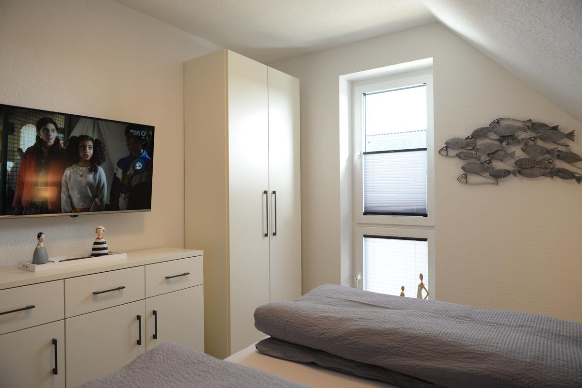 Das Schlafzimmer ist mit einem Doppelbett, Sat/TV, elektrische Außenrollläden + Verdunklungsplissees ausgestattet.
