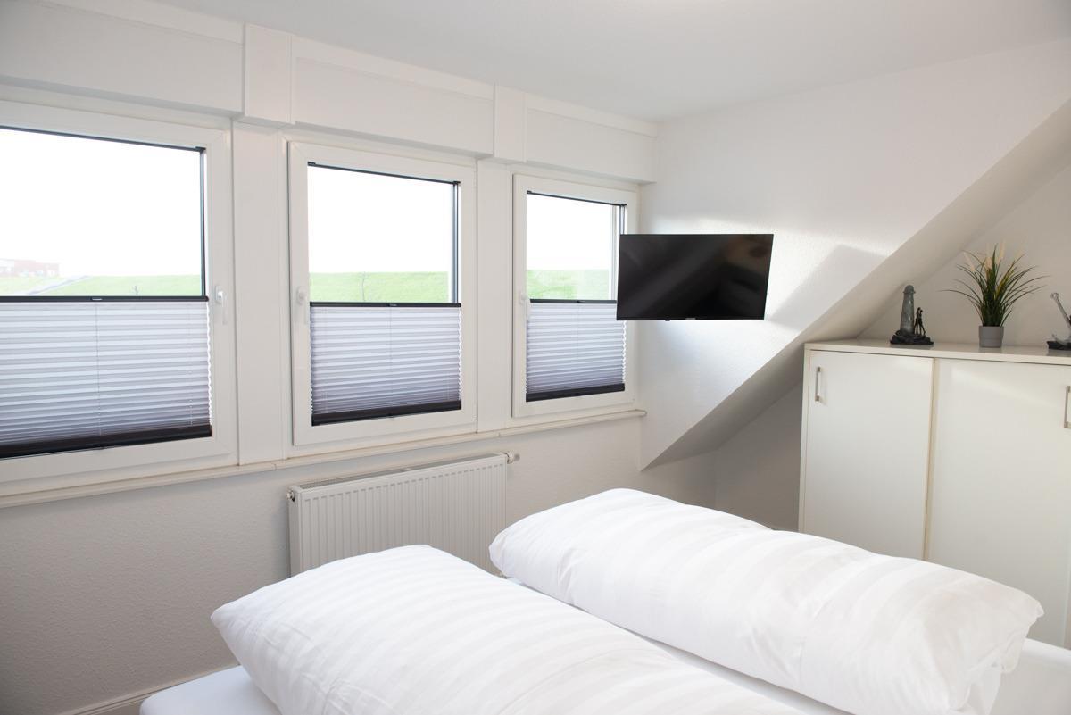 Die Wohnung liegt in einer Top-Lage mit Blick zum Deich. Das Wohn/Esszimmer ist mit einer gemütlichen Couch u. 2 Sessel, einem Flachbildschirm-Fernseher, einer Essgruppe und einer voll ausgestatteten Einbauküche eingerichtet.Von dort aus gelangen Sie auf eine überdachte Dachlounge und können den Sonnenuntergang geniesen, zusätzlich bieten 2 große Panorama-Veluxfenster einen direkten Blick auf den Deich und die Promenade.