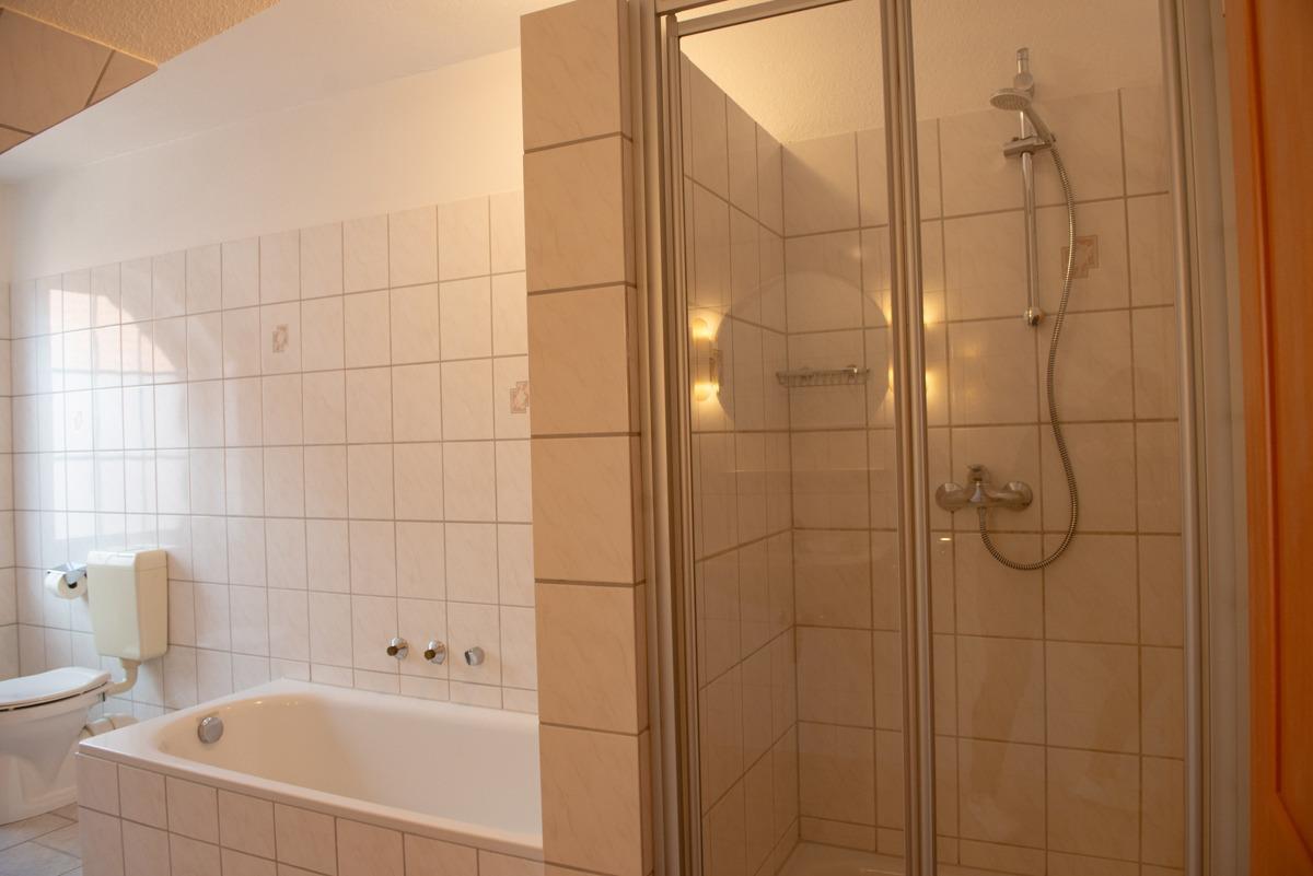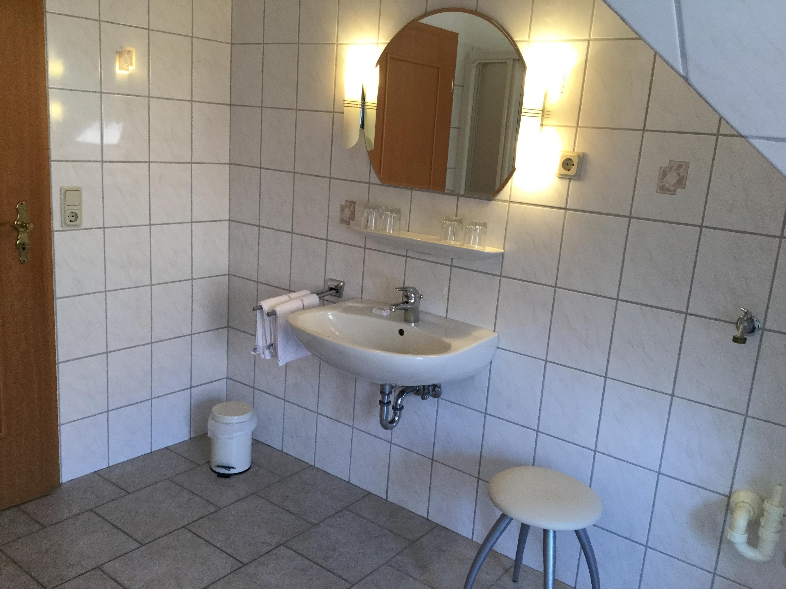 Das große Bad ist mit Waschbecken, Dusche und WC ausgestattet.