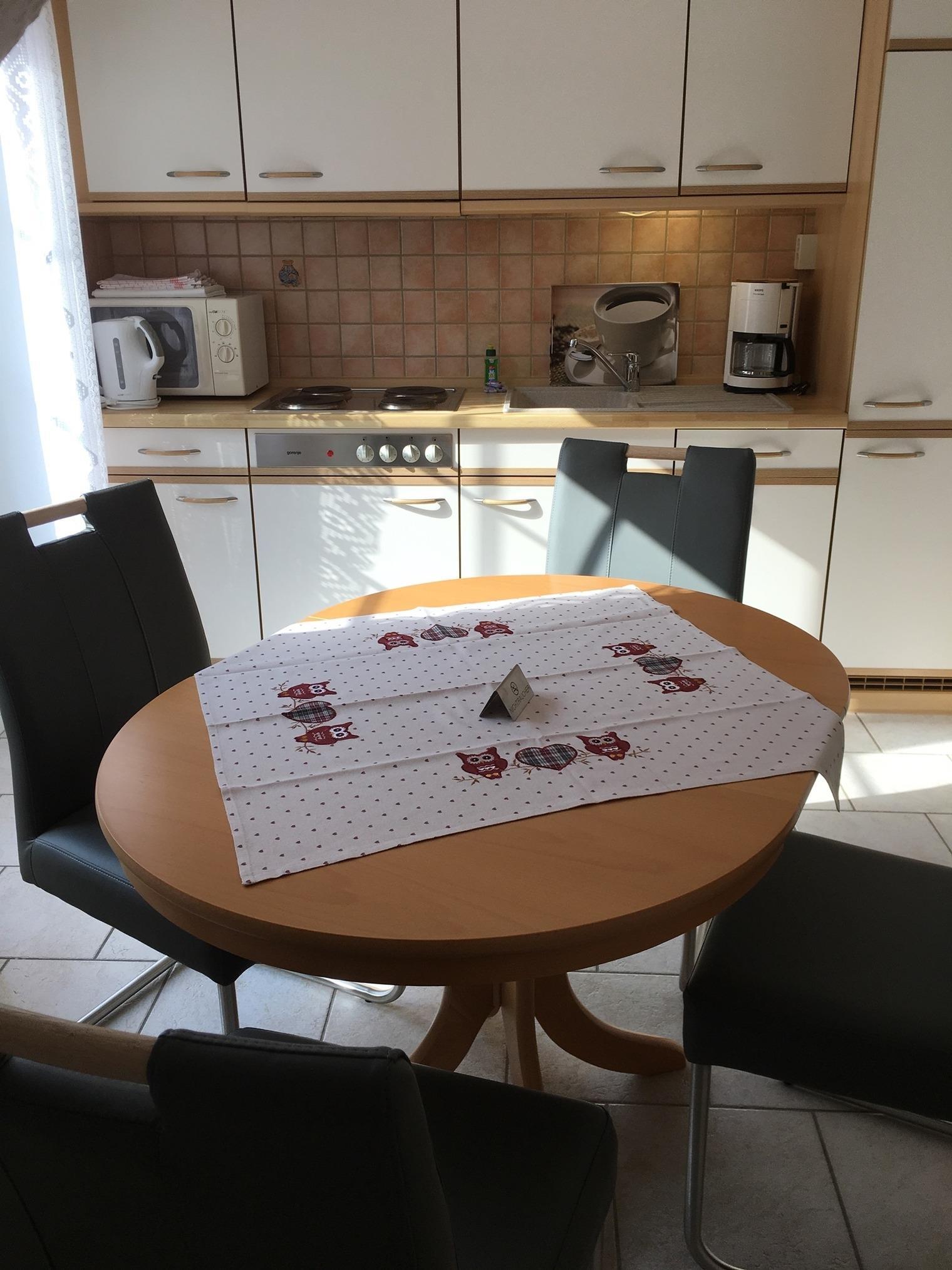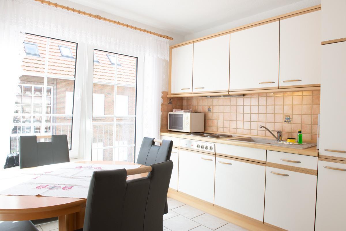 Küchenzeile ist mit Mikrowelle, Geschirrspüler, Kaffeemaschine, Wasserkocher, Toaster und diversem Geschirr ausgestattet. In der Küche befindet sich eine Essgruppe mit 4 Stühlen, von hier aus erreichen Sie den möblierten Balkon mit Markise.