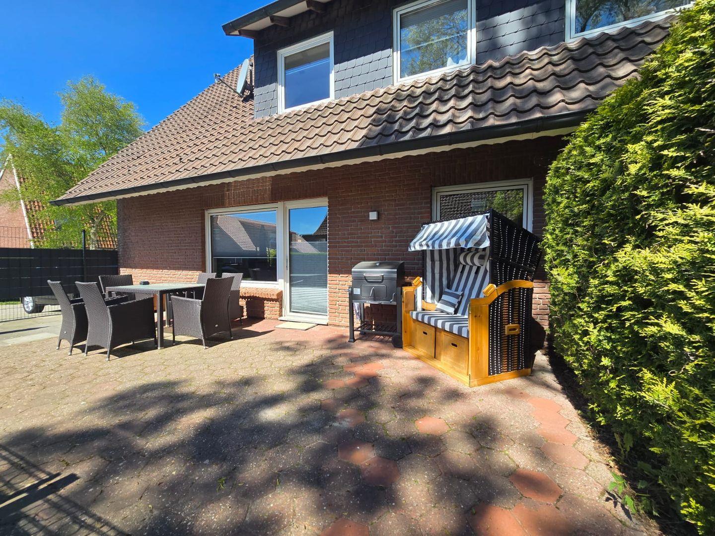 Ein besonderes Highlight der Wohnung ist die große Terrasse, auf der ein eigener Strandkorb für entspannte Stunden an der frischen Nordseeluft sorgt. Ob Frühstück in der Morgensonne oder gemütliche Grillabende am Abend – die Terrasse bietet den perfekten Rückzugsort im Freien. Ein moderner Grill steht für gemeinsame Abende mit Familie oder Freunden bereit.