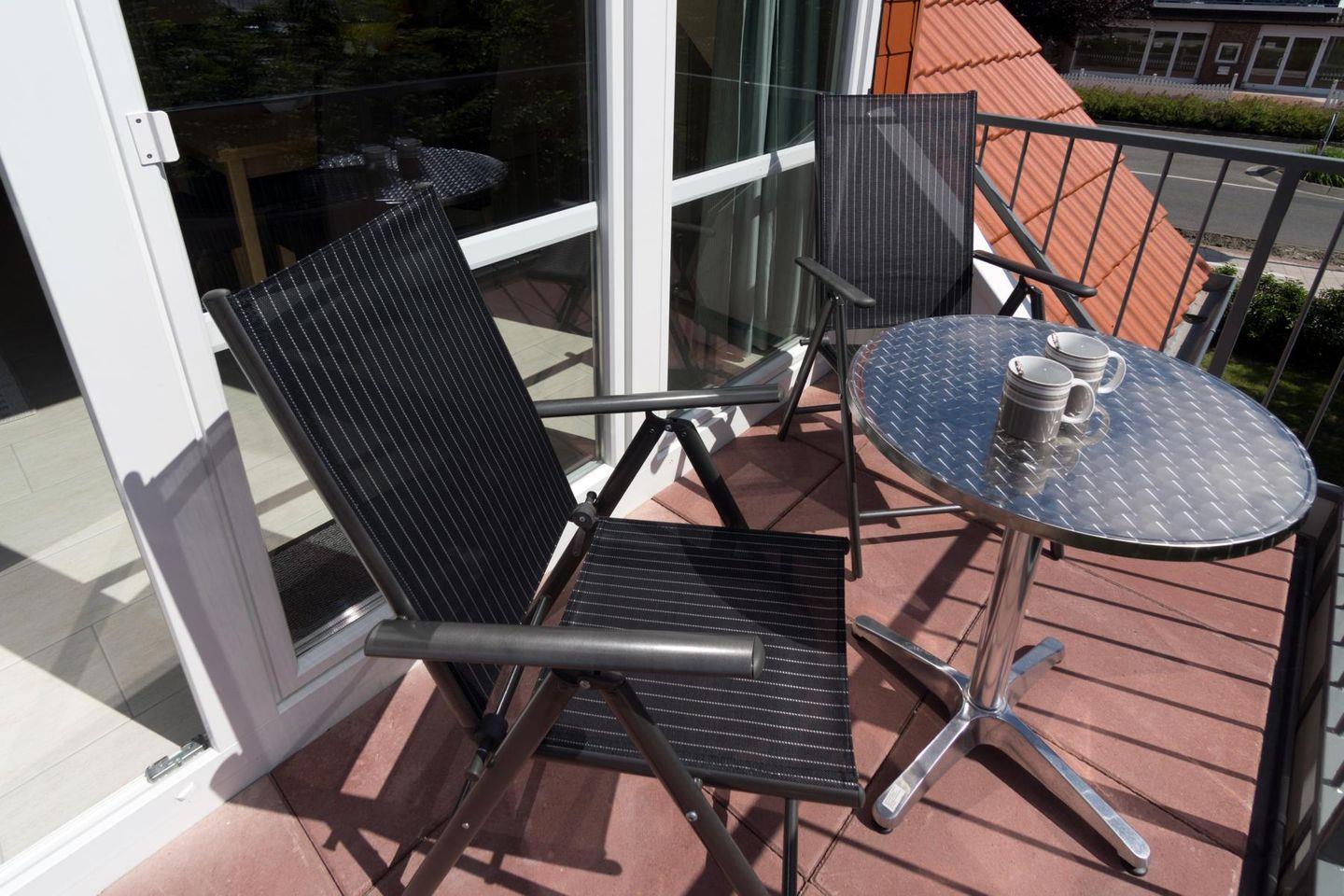 Der möblierte Balkon bietet einen schönen Ausblick in den benachbarten Garten.