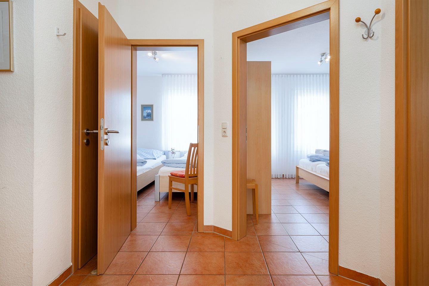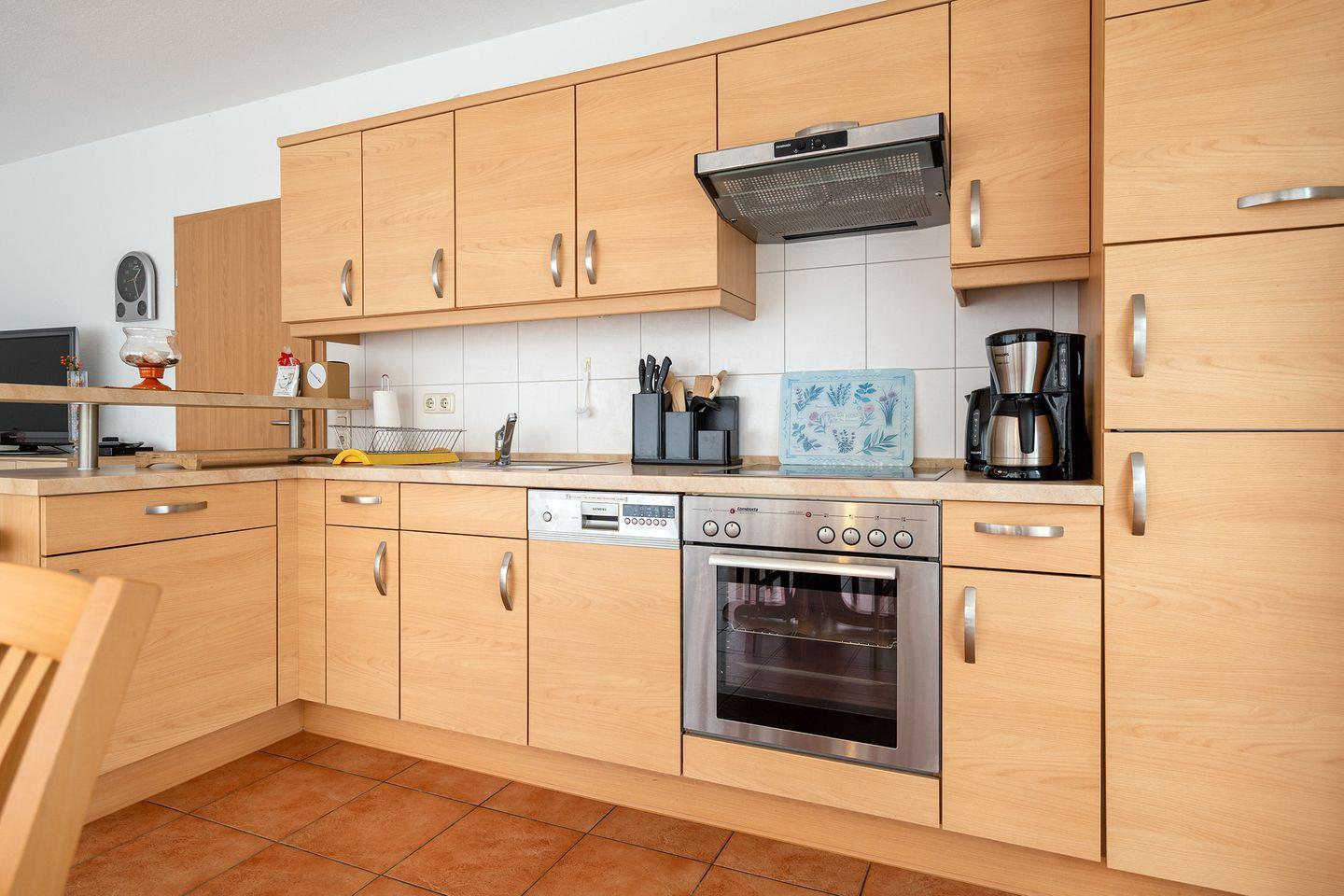2 Schlafräume, Dusch-Bad mit Hänge-WC, Waschmaschine und Trockner, beheiztem Handtuchhalter und Föhn sowie Bügeleisen und Bügelbrett. Dusche mit niedrigem Einstieg. Bis auf die beiden Schlafräume, verfügt die Wohnung über eine angenehme Fußbodenerwärmung. Alle Fenster haben Außenrollos. Terrasse mit Mobiliar und Elektrogrill. Ein Bollerwagen steht zur Verfügung (ohne Garantie).