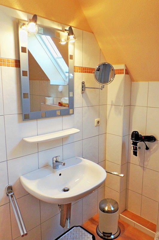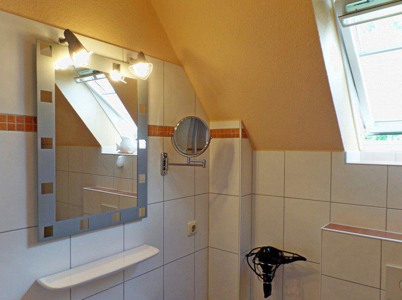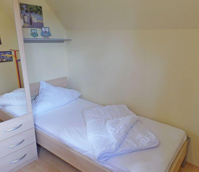 Im Obergeschoß sind 2 große Schlafräume (1 * mit Doppelbett, 1 * mit 2 Einzelbetten). In einem Schlafzimmer befindet sich ein weiterer Fernseher. Dusch-Bad mit WC, Fußbodenerwärmung und Haarföhn.