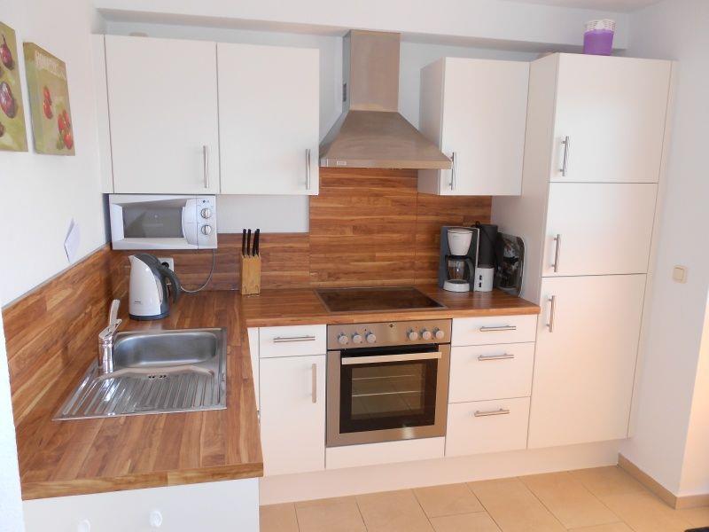 Die Küche ist mit allem Komfort eingerichtet (Geschirrspülmaschine, Backofen, Kühlschrank mit Gefrierfach, Kaffeemaschine, Wasserkocher, Toaster). Weitere Extras: Bügelbrett und Bügeleisen. Ein PKW-Einstellplatz steht vor dem Haus zur Verfügung.