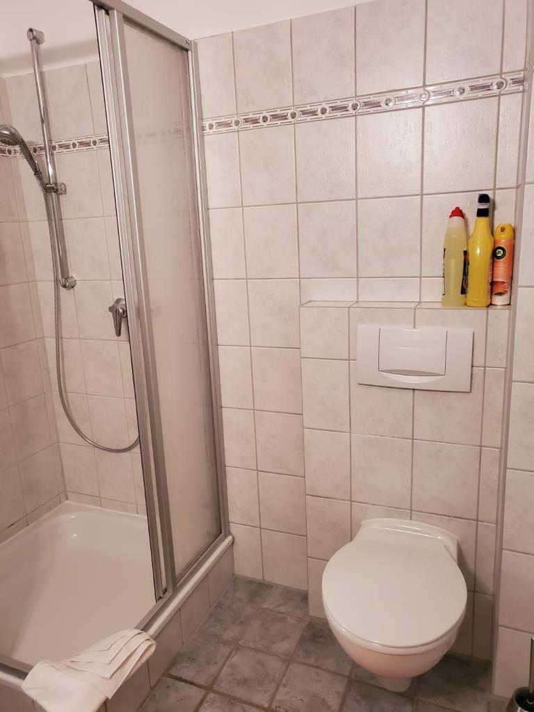 Spülmaschine) und Essecke sowie separates Badezimmer mit Dusche/WC. Vom
