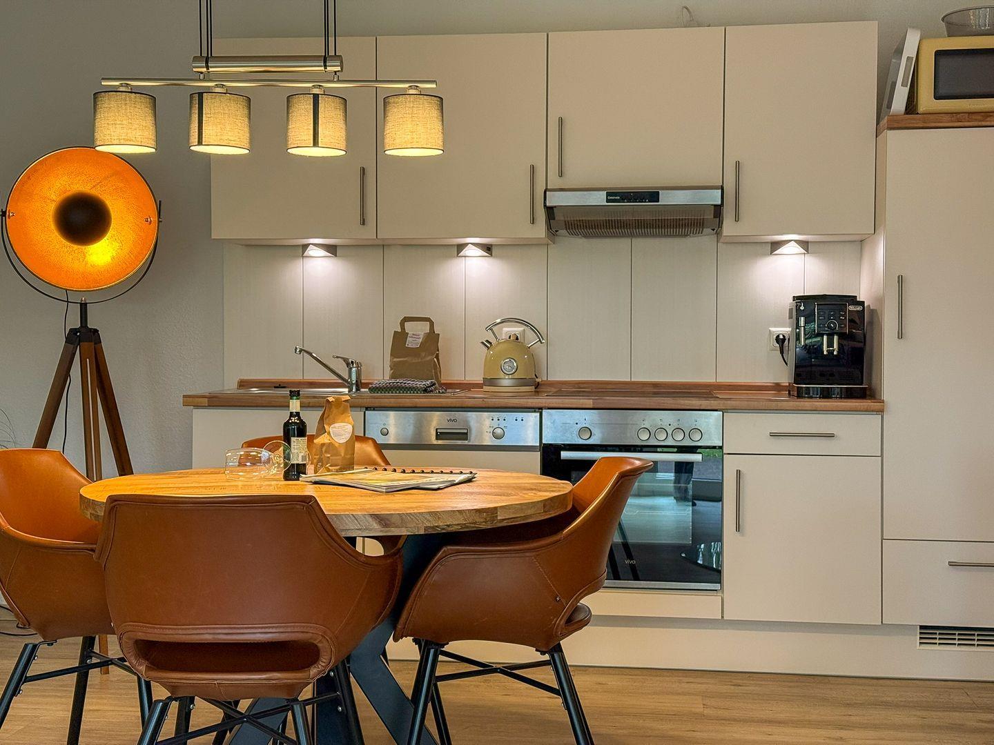 Die geräumige Ferienwohnung ist hochwertig ausgestattet und bietet Ihnen im Wohnzimmer einen 4K-Smart-TV mit 49" und Apps wie Netflix, Amazon Prime Video und viele mehr. Ein Highlight der Wohnung ist der schöne, moderne Kaminofen. Mit ein wenig Holz können Sie es sich hier so richtig gemütlich machen. Zudem stehen ein Internetradio und ein Blu-Ray-Player samt kleiner, aktueller Filmsammlung für Sie bereit. Die Küche ist mit Mikrowelle, Ceran-Kochfeld, Backofen, Kühlschrank inkl. Gefrierfach, Geschirrspüler, Wasserkocher, Toaster, Eierkocher sowie ausreichend Koch- und Essgeschirr sehr gut ausgestattet. Außerdem ist nicht nur eine Filter-Kaffeemaschine vorhanden, sondern auch ein Tassimo-Gerät.