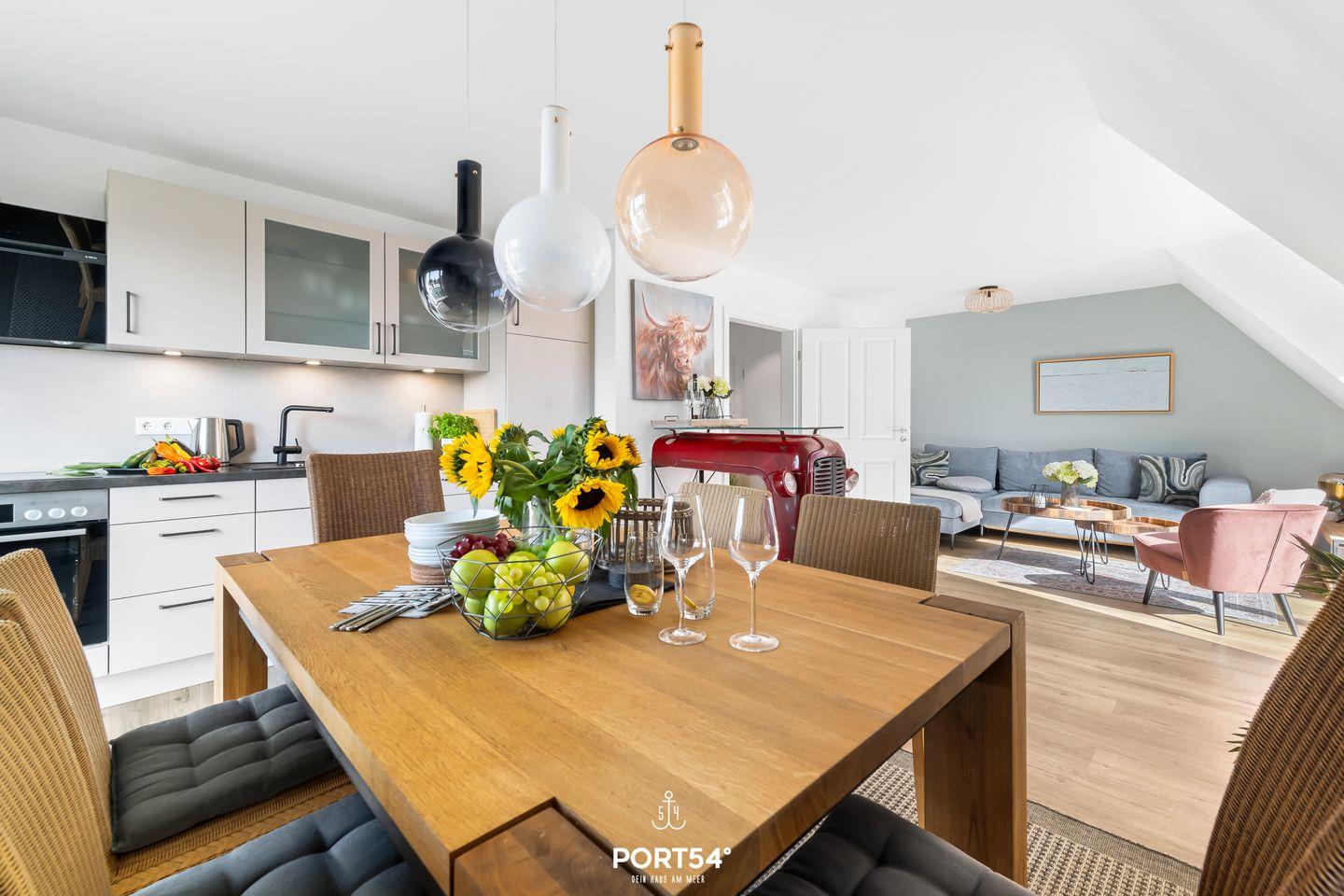 Der lichtdurchflutete Wohnbereich ist mit einer gemütlichen Wohnlandschaft inklusive Schlaffunktion und einem Flachbildfernseher ausgestattet. Die angrenzende Küche ist offen gestaltet. Der hochwertige Esstisch ist der „Ankerplatz“ für die ganze Familie, zum gemeinsamen Essen oder für einen Spieleabend. Die Küche ist komplett ausgestattet, so dass Sie auch als Selbstversorger oder für einen geselligen Kochabend gerüstet sind.