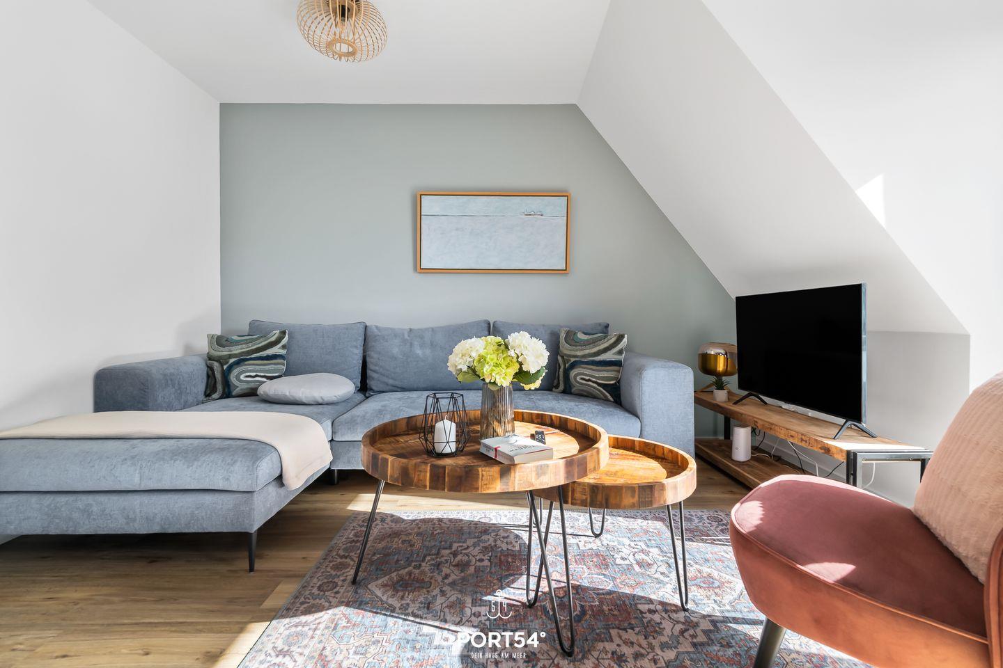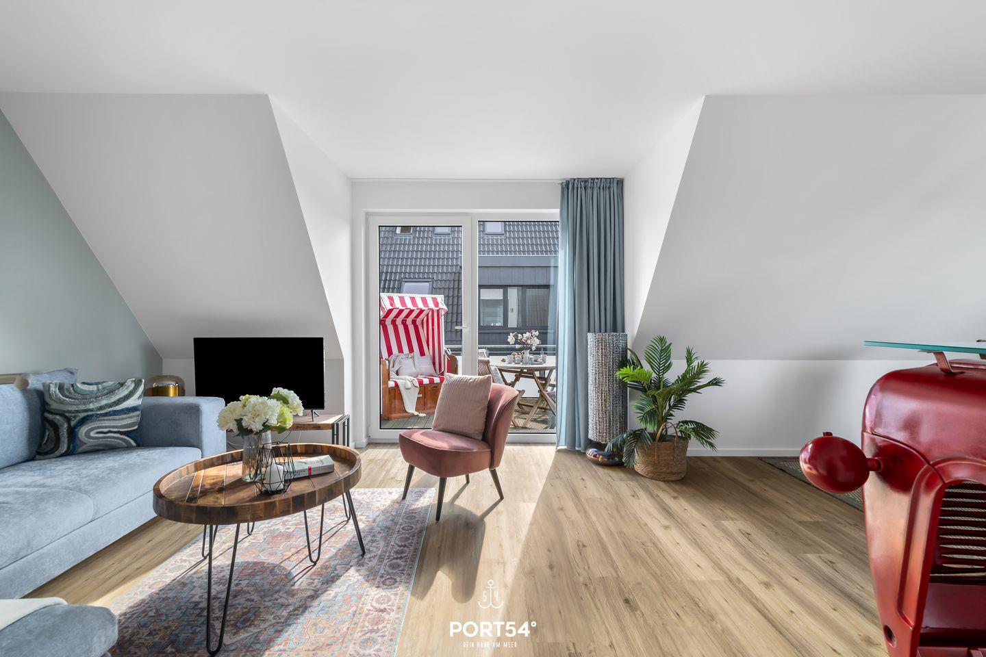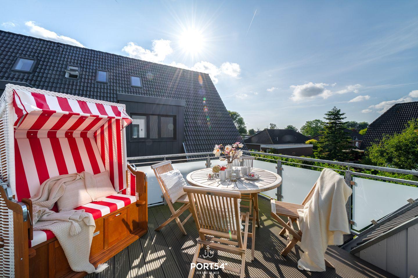 Bodentiefe Fenster ermöglichen den Ausblick in die nähere Umgebung. Vom Wohnzimmer aus gelangen Sie zum vollmöblierten Balkon mit Strandkorb. Im Strandkorb frühstücken, lesen oder einfach mal zurücklehnen und die Sonne genießen, was gibt es Schöneres?