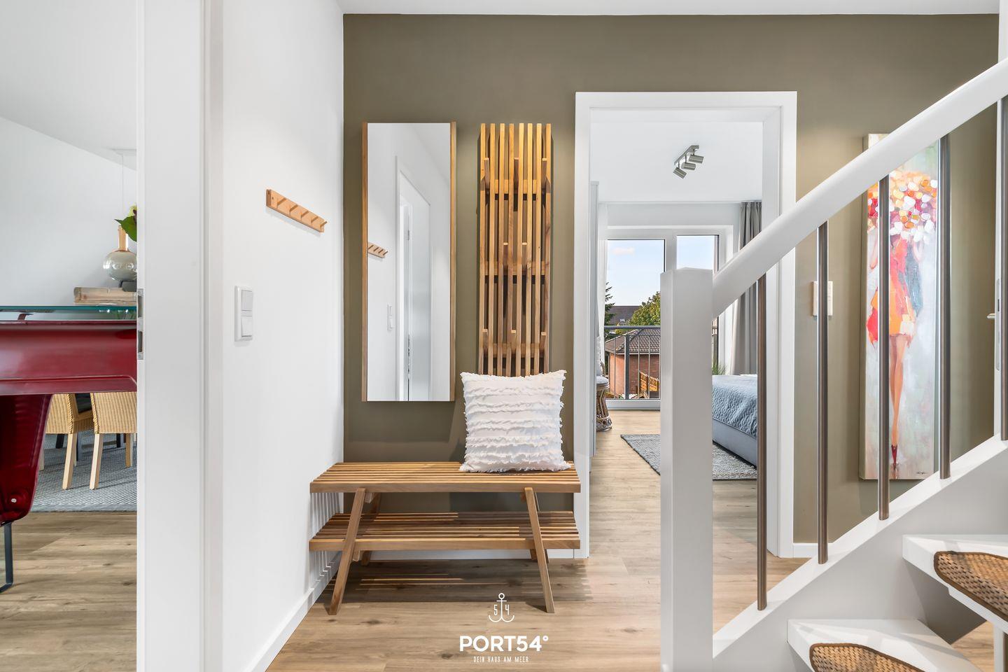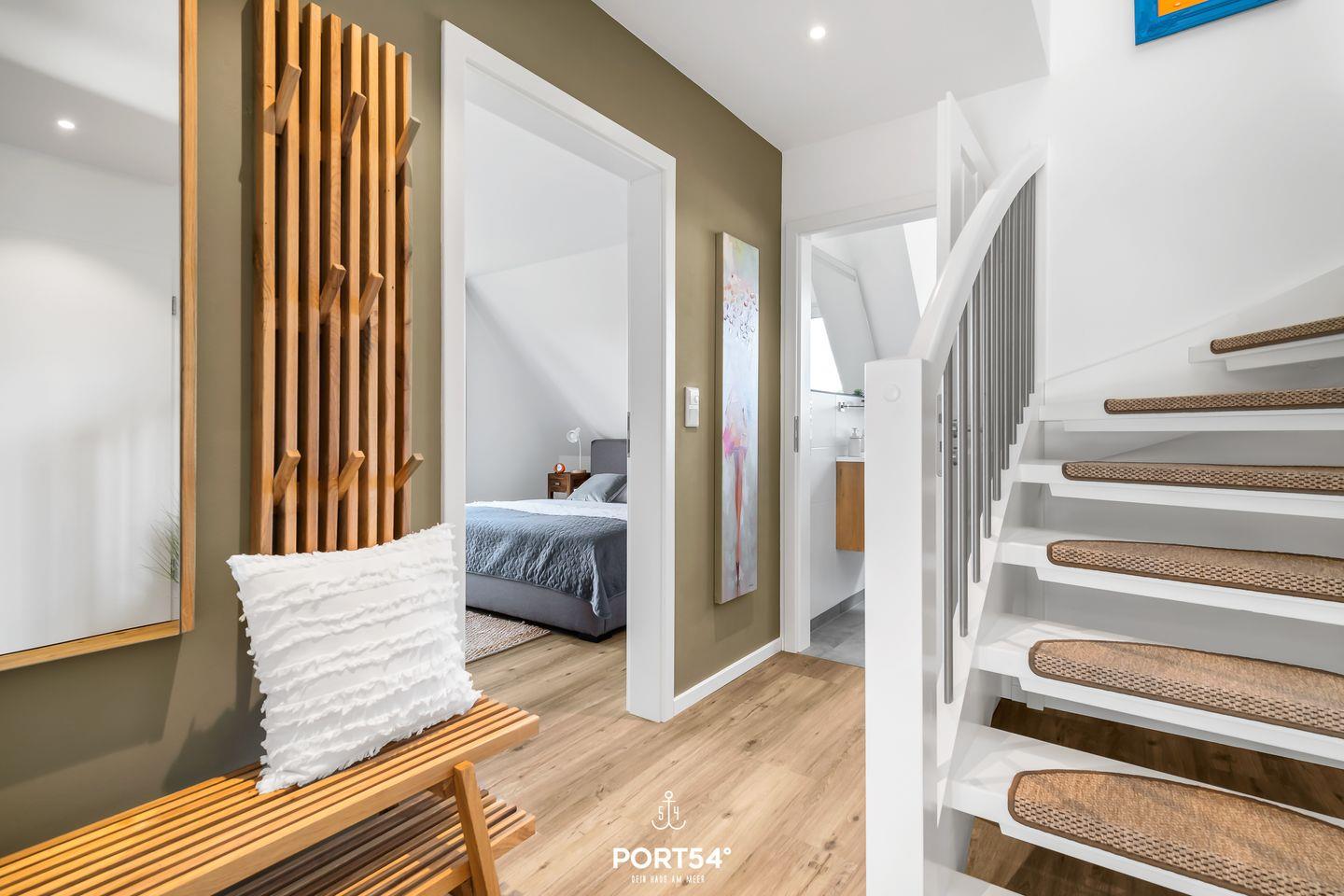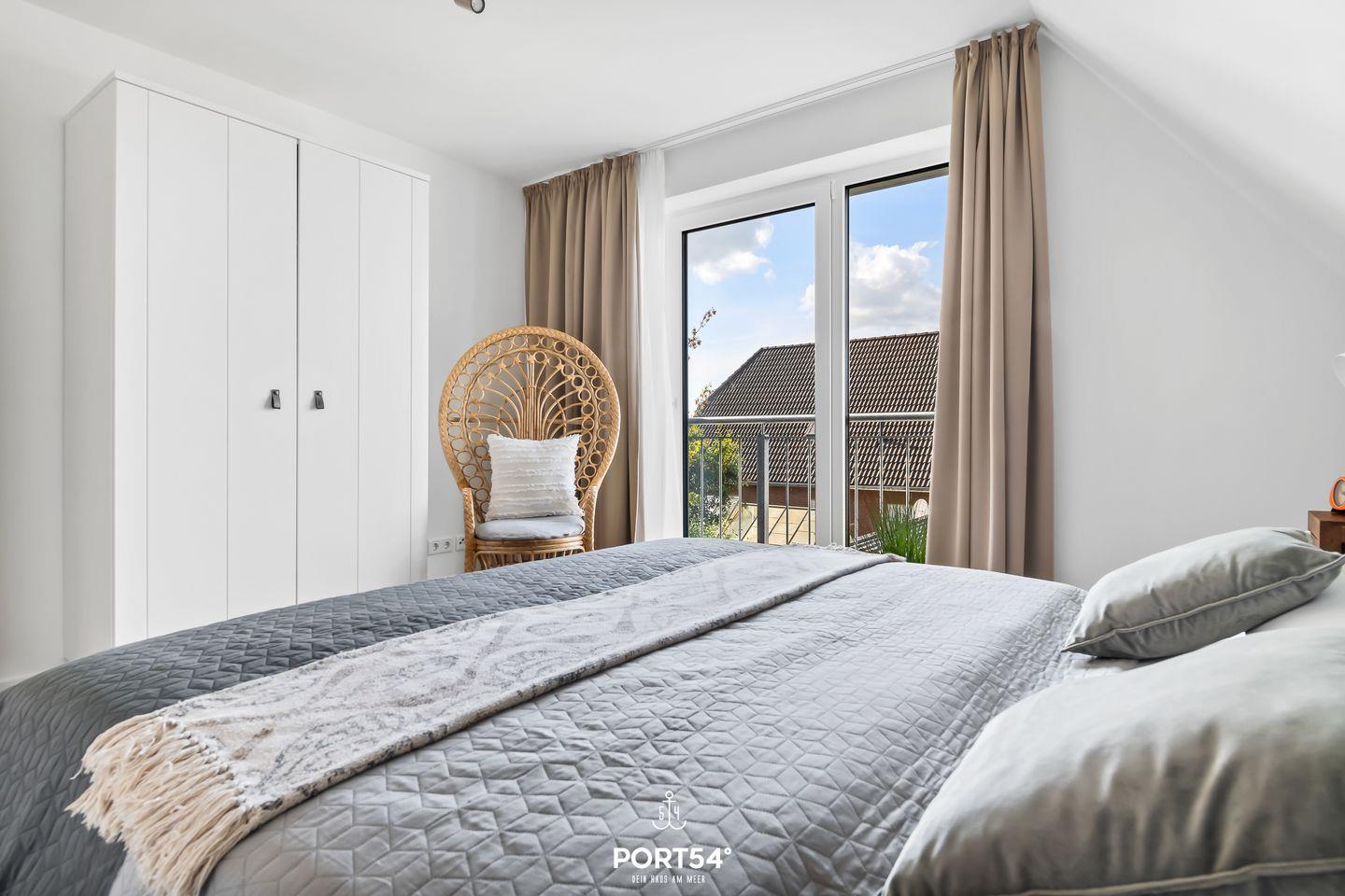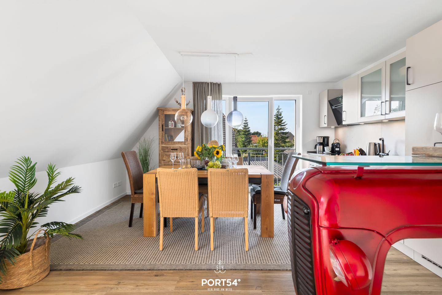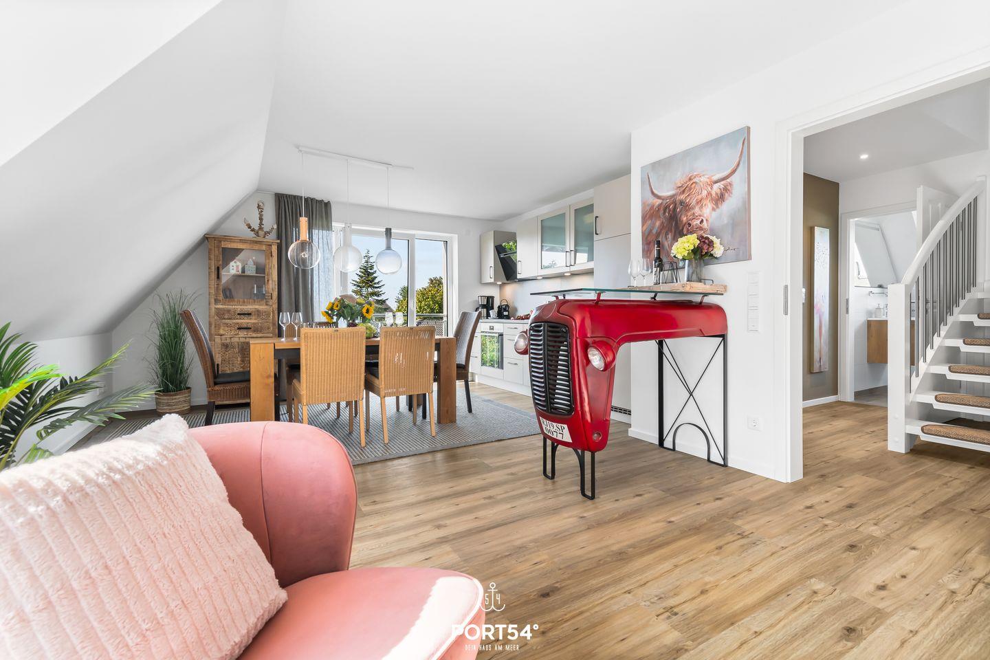 Die im OG gelegene Neubau-Ferienwohnung "Westwind" über 2 Etagen, mit Balkon ist für 6 Personen geeignet. Der Wohnbereich ist mit einem Schlafsofa und TV ausgestattet. Die voll ausgestattete Küche ist offen zum Wohnzimmer. Bodentiefe Fenster sorgen für viel Tageslicht. Es gibt 2 Schlafzimmer: je 1 Bett (180x200cm) mit Verdunkelungsmöglichkeiten. 1 Badezimmer mit einer ebenerdigen Dusche und ein extra Gäste-WC im OG sind vorhanden.