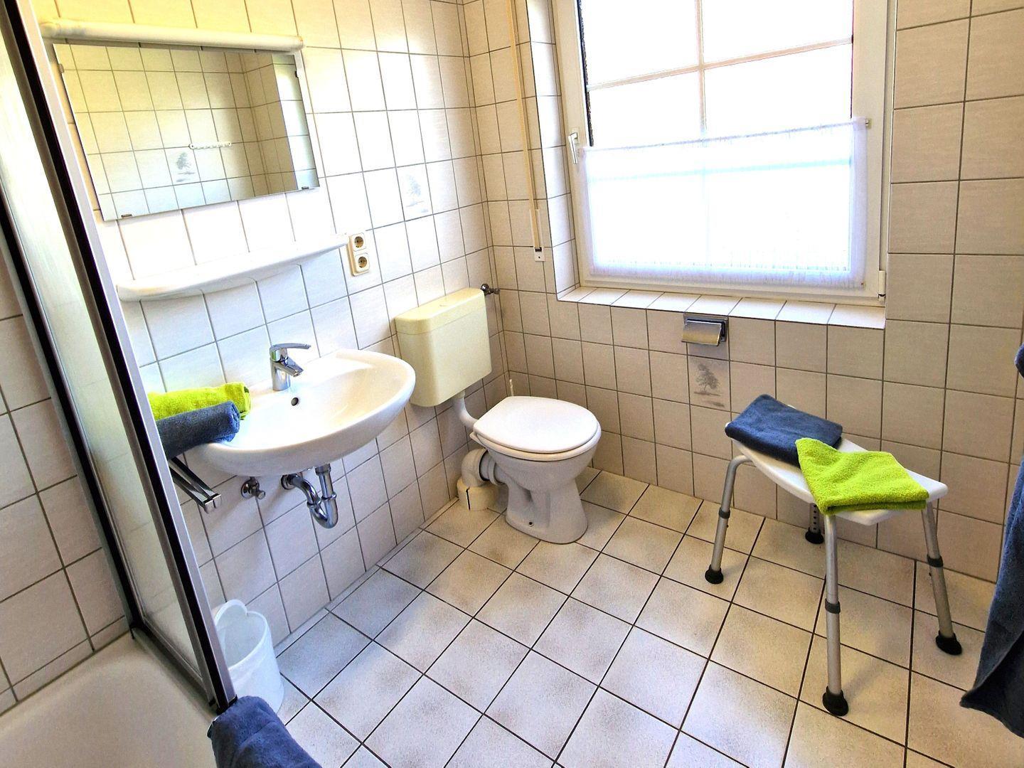 Das Bad ist mit Dusche und Fenster ausgestattet.
